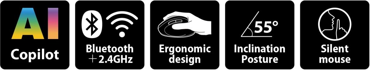 Genius Ergo 8350S je vertikálna bezdrôtová myš s ergonomickým sklonom 55° pre zníženie únavy zápästia a ramien, duálnym pripojením Bluetooth 5.3 a 2,4 GHz, nastaviteľným DPI až 2400 a tlačidlom Copilot pre Windows 11. Ponúka tiché kliky, 6 programovateľných tlačidiel a dlhý dosah až 10 m pre pohodlnú prácu v kancelárii alebo home office.Kľúčové vlastnosti