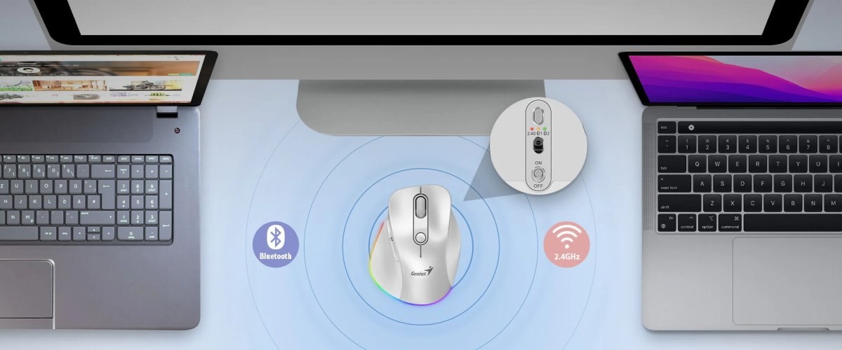 Myš podporuje dva spôsoby pripojenia - Bluetooth 5.0 a 2,4 GHz cez USB prijímač, pričom môže byť pripojená až k trom zariadeniam súčasne. Prepínanie medzi zariadeniami sa realizuje jedným tlačidlom, čo je ideálne pre používateľov pracujúcich s viacerými zariadeniami. Pracovný dosah dosahuje až 10 metrov, čo poskytuje výnimočnú slobodu pohybu.