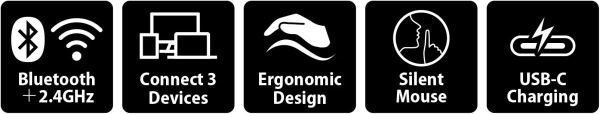 Myš podporuje dva spôsoby pripojenia - Bluetooth 5.0 a 2,4 GHz cez USB prijímač, pričom môže byť pripojená až k trom zariadeniam súčasne. Prepínanie medzi zariadeniami sa realizuje jedným tlačidlom, čo je ideálne pre používateľov pracujúcich s viacerými zariadeniami. Pracovný dosah dosahuje až 10 metrov, čo poskytuje výnimočnú slobodu pohybu.
