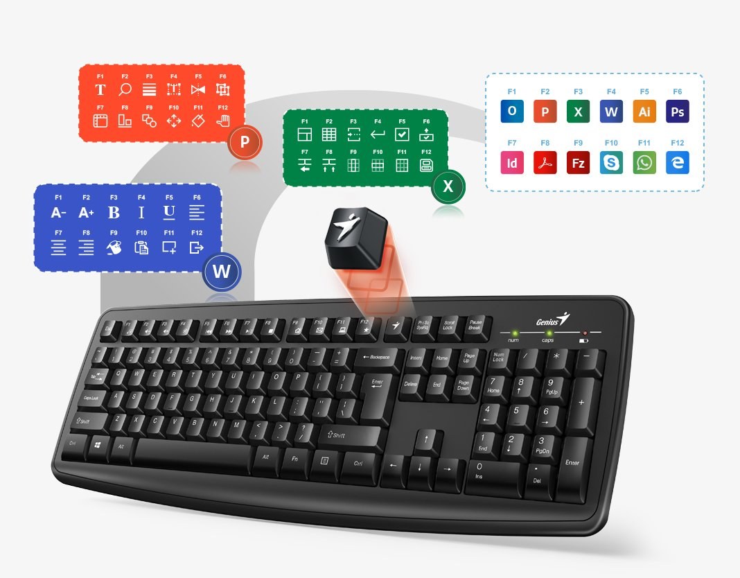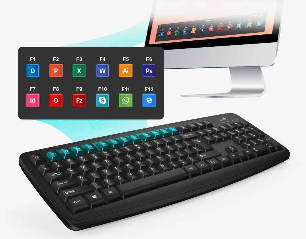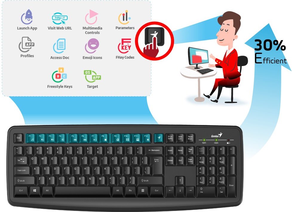 Ide o prispôsobiteľnú klávesnicu. Spolu s Genius Smart Engine poskytuje úplnú kontrolu nad 12 funkčnými klávesmi, ktoré sú jedinečné pre váš obľúbený web, aplikácie, sociálne alebo obchodné integrácie.