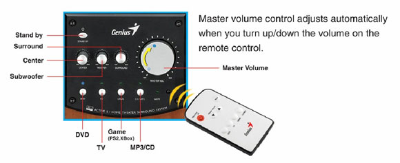 Sestava nabízí samostatné ovládání hlasitosti, úrovně basů subwooferu, regulace prostorového surround zvuku, umlčení a další ovládací prvky. Pro pohodlné nastavování a kontrolování soupravy slouží infračervené dálkové ovládání.
