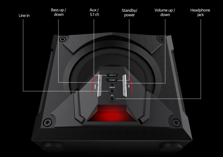Subwoofer dopĺňa LED podsvietenie, ktoré zobrazuje náhodné farby pri prehrávaní. K dispozícii máte diaľkový ovládač pre nastavenie hlasitosti, basov, alebo zmeny vstupného zdroje.