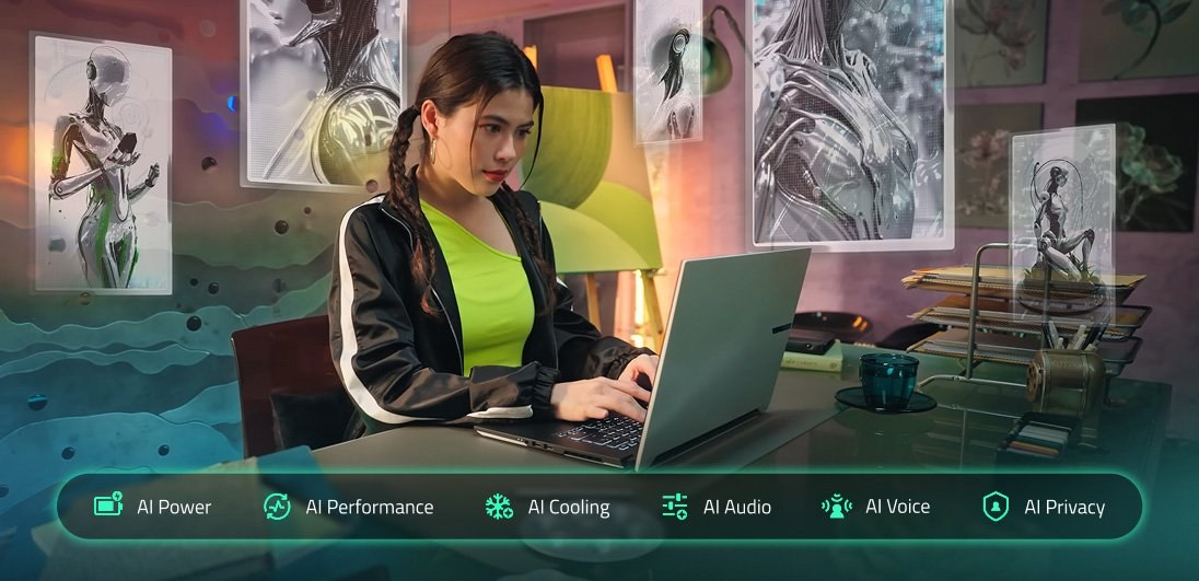 Revolučný AI asistent GiMATE prináša novú dimenziu ovládania notebooku. Stačí stlačiť tlačidlo a vysloviť príkaz - systém okamžite reaguje na vaše potreby. GiMATE inteligentne prispôsobuje chladenie podľa záťaže systému a v režimoch s nízkou spotrebou vytvára úplne tichý režim bez hluku ventilátorov (0dB Ambient). Vďaka integrácii funkcií Copilot+ PC získate prístup k pokročilým AI nástrojom ako Live Captions pre titulkovanie v reálnom čase, Cocreator pre kreatívnu tvorbu a vylepšené videohovory s automatickými efektmi.