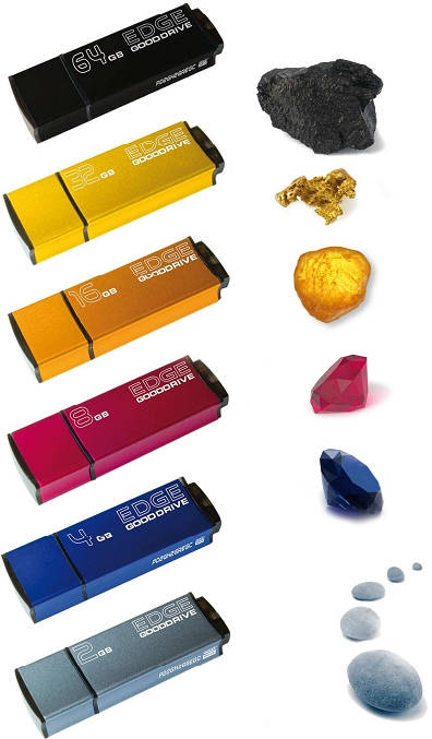 Edge s kapacitou 2GB je pokrytý povlakom kobaltovej farby, 4GB – zafír, 8GB – rubín, 16GB – jantár, 32GB – zlato a 64GB – antracit.