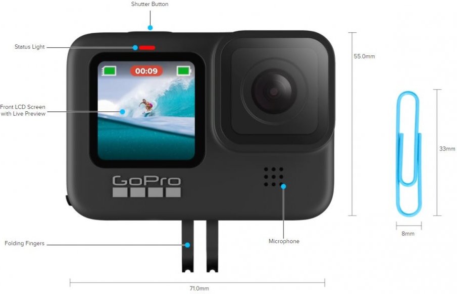 Kamera dokáže zachytiť video už 30 sekúnd pred začatím záznamu, neprídete tak o žiaden okamih ani v prípade, že stlačíte tlačilo spúšte príliš neskoro. V prípade fotografovania je dostupná podobná funkcia. Zachytíte fotografie už 1,5 sekundy pred stlačením spúšte. Vybrať si tak môžete tu najlepšiu fotografiu, alebo použiť sériu fotografií ako krátke video. Streamovanie s funkciou HyperSmooth nahradí iné zariadenia a ponúkne špičkový obraz s takmer neobmedzenými možnosťami montáže. Oproti GoPro Hero 8 je tiež kapacita batérie navýšená na 1720 mAh.Technické parametre