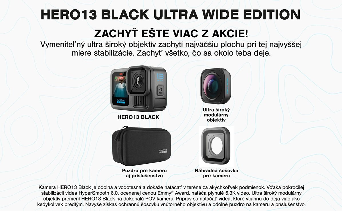 športová kamera, vodeodolná, max. rozlíšenie 5.3K (5312x2988), 2,27" displej dotykový, WiFi, batéria 1900 mAh, stereofónny zvuk, stabilizácia obrazu, hlasové ovládanieZobraziť viac