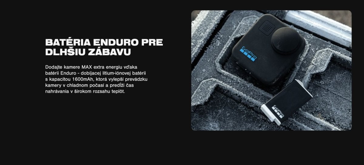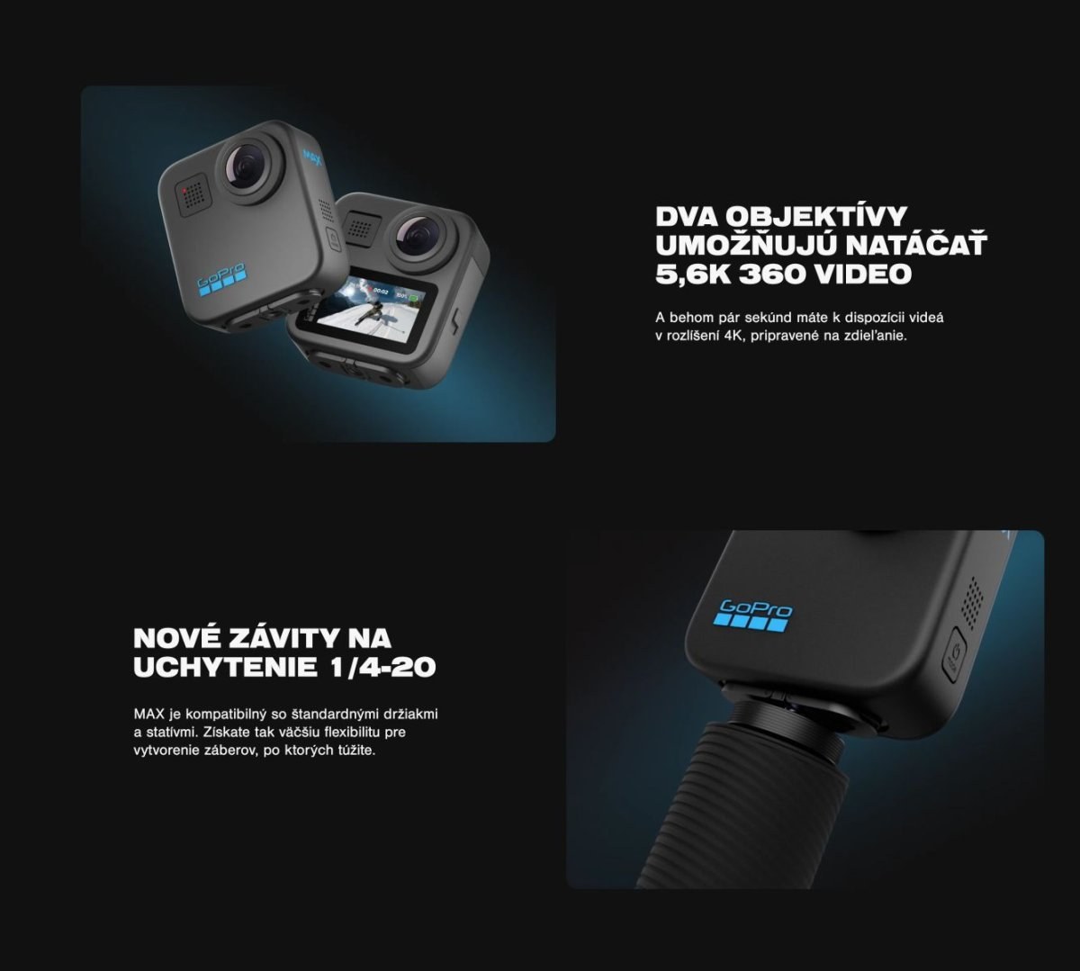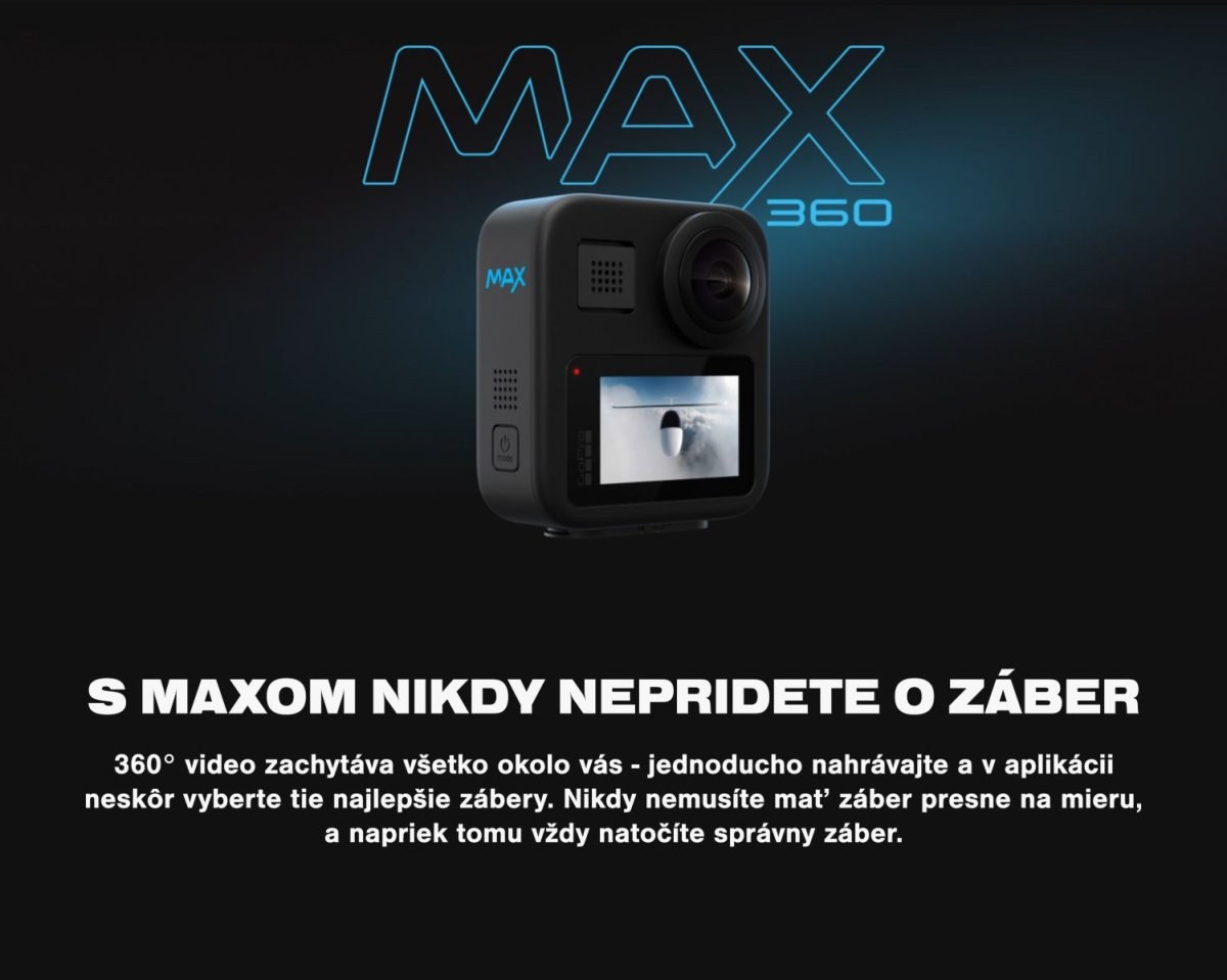 GoPro MAX je výnimočná 360° kamera, ktorá posúva možnosti kreatívneho snímania na novú úroveň. Umožňuje natáčať plynulé videá v ohromujúcom 5,6K rozlíšení s dokonalou stabilizáciou Max HyperSmooth a zámkom horizontu. Vďaka duálnym objektívom môžete zachytiť sférické zábery, alebo prepnúť na režim HERO pre klasické videá a fotografie. Kamera automaticky vymaže selfie tyč zo záberu, čím vytvorí dojem, že vás sleduje dron. Špičkový 360° zvuk so šiestimi mikrofónmi, odolné vodotesné telo a kompatibilita s aplikáciou GoPro Quik z nej robia ideálneho partnera na vlogy, akčné športy aj kreatívne zábery z vlastného pohľadu. MAX je navrhnutá tak, aby zachytila každý moment – z každého uhla.gopro.com/en/us/shop/cameras/learn/max/CHDHZ-203-master.html