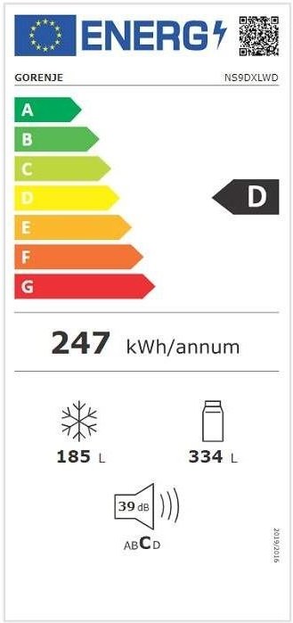 Side by SideNS9DXLWD, Farba: Šedá, Otváranie dvierok: Pravé otváranie dverí chladničky/ľavé otváranie dverí mrazničky, Materiál dverí: Laminovaná ocel, Klimatické triedy: SN, N, ST, 1 kompresor, Celkový objem: 519 l, Kapacita chladiaceho oddelenia: 334 l, Kapacita mraziaceho oddelenia: 185 l, Mraziaca kapacita za 24 hodín: 11 kg, Skladovací čas pri výpadku el. energie: 8 h, Elektronické ovládanie SensoTech, Displej: LED displej, Zvukový alarm otvorených dverí, Cirkulácia vzduchu: MultiFlow chladenie - chladiaca časť, Bez námrazová technológia NoFrost Plus, Dávkovač vody, Funkcia rýchleho mrazenia FastFreeze, Výbava chladničky: LED osvetlenie, 5 sklenených políc, nádoba na mäso, Police vo dverách chladničky: 3 police vo dverách, Zásuvka na zeleninu: 2 zeleninové zásuvky, 2 stojany na vajíčka (12×), Výbava mrazničky: Osvetlenie v mrazničke: LED osvetlenie, Priestor pre mrazenie: 2 zásuvky, Police dverí mrazničky: 4, 5 sklenených políc. 1 forma na ľad. Energetická trieda: D, Ročná spotreba el. energie: 407 kWh, Ročná spotreba el. energie: 247 kWh, Úroveň hluku (max.): 39 dB(A)re 1 pW, Trieda vydávaného hluku: C, Rozmery výrobku (vxšxh): 178,6 × 91 × 64,3 cm, Kód produktu: 20009999, EAN kód: 3838782616990