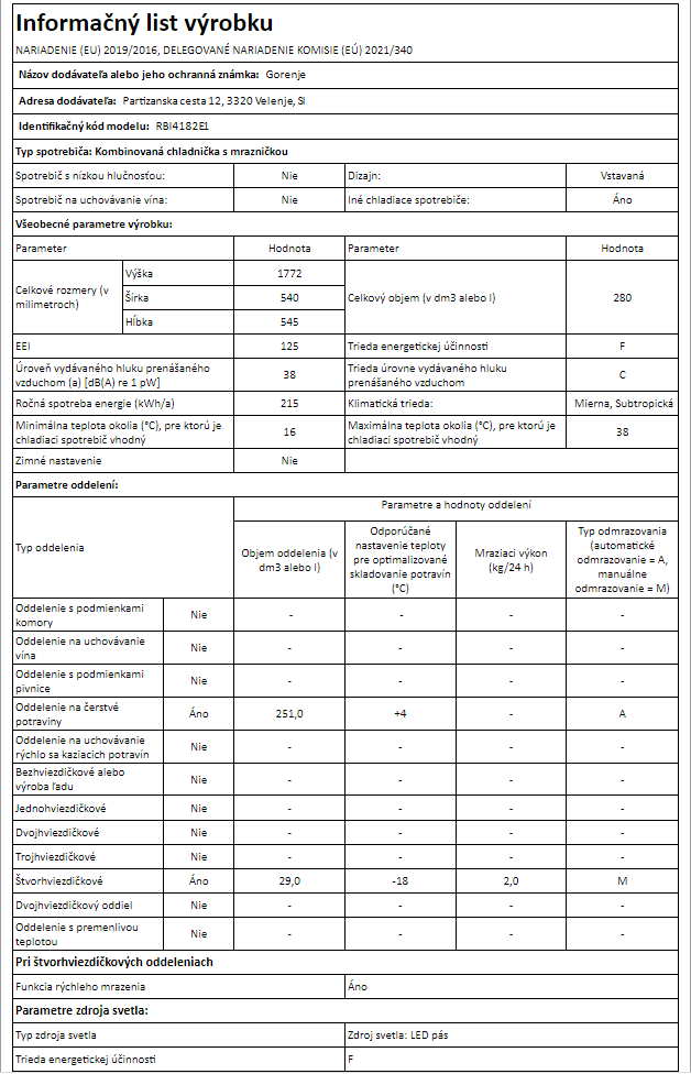 Gorenje RBI4182E1, vstavaná chladnička