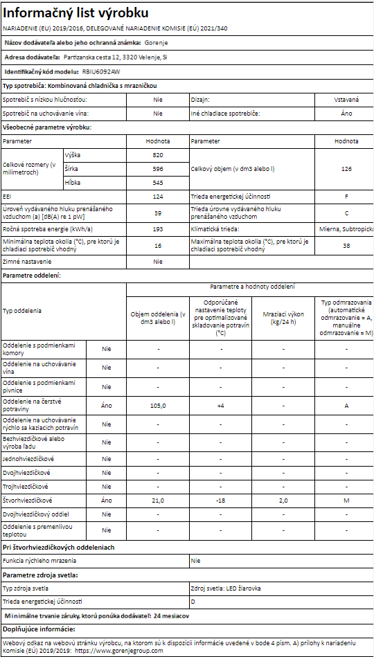 Gorenje RBIU 6092 AW, vstavaná chladnička