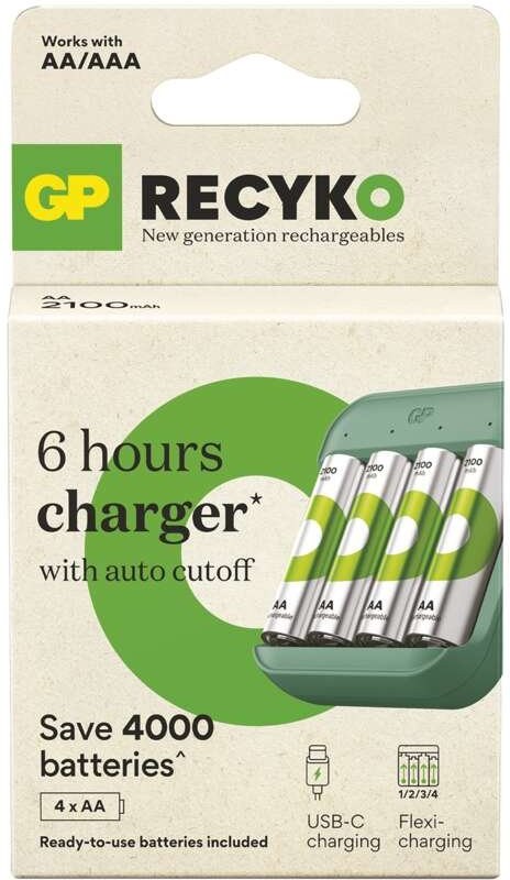 nabíjačka AAA, AA batérií, samostatné nabíjanie 1 až 4 batérií, kompatibilné s PD nabíjaním USB-C, v balení 4× AA GP ReCyko 2100 mAhZobraziť viac