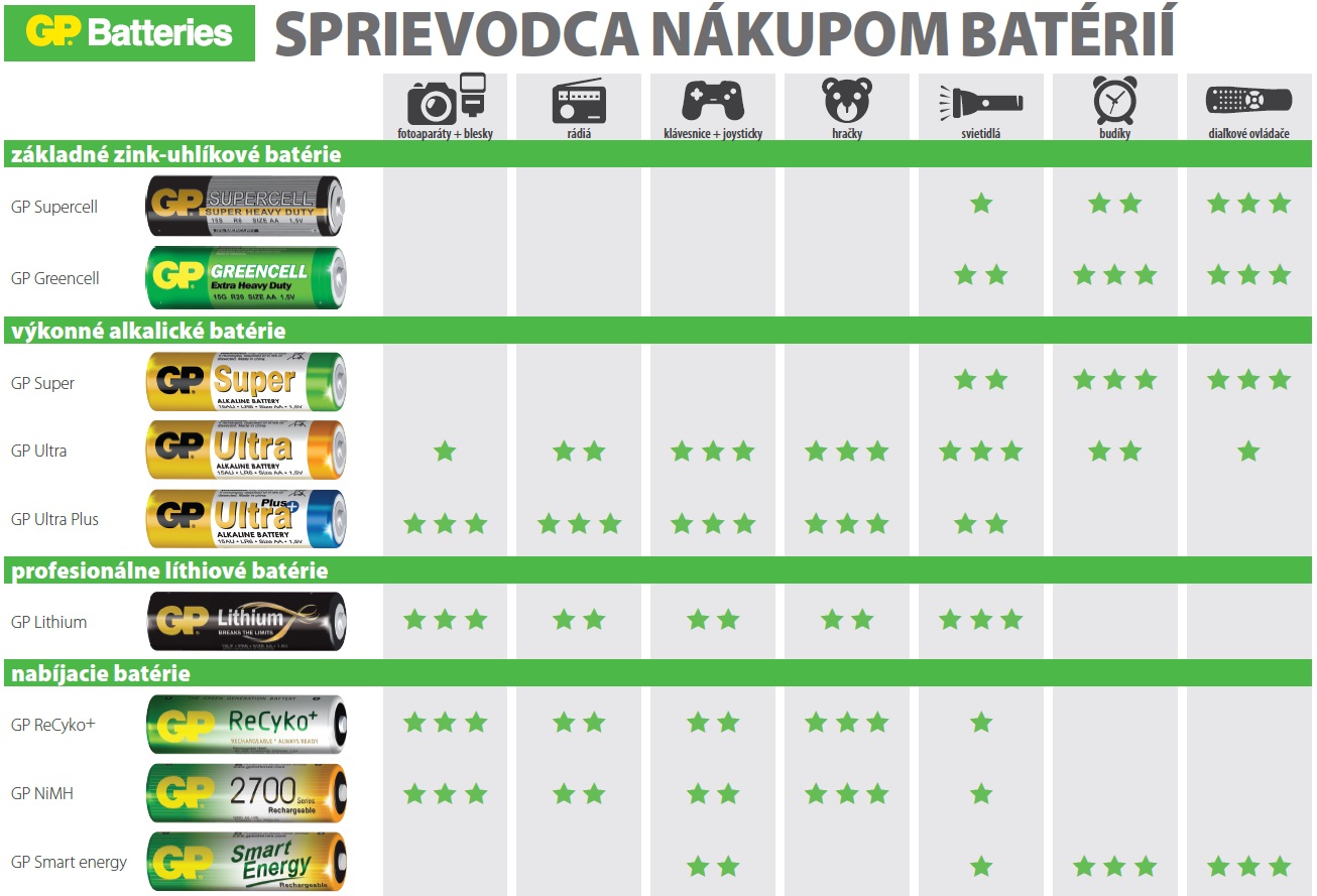 Spoločnosť GP Batteries dodáva do celého sveta všetky druhy batérií, vrátane tých najmenších - článkových a špeciálnych. Najmä tie symbolizujú skutočné umenie výroby, pretože v ich maličkom balení sa v nich ukrýva obrovské množstvo energie. S postupnou modernizáciou domácností, kde smartfóny nie sú len mobilnými telefónmi, sa ich spotreba neustále zvyšuje. Buďte aj vy inteligentní a vybavte svoju domácnosť alebo kanceláriu batériami, ktoré stoja za to.
