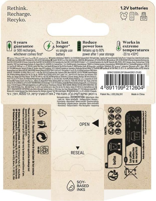 GP sa nezameriava len na výrobu špičkových výrobkov, ale aktívne hľadá spôsoby, ako znížiť vplyv svojich výrobkov a ich obalov na životné prostredie. Ich inovatívny rad nabíjateľných batérií a nabíjačiek s názvom Recyko je príkladom tohto úsilia. Tieto výrobky sú balené v papierových obaloch, ktoré neobsahujú plasty. Tým sa podporuje používanie recyklovaných materiálov a znižuje sa množstvo odpadu. Vďaka týmto obalom šetrným k životnému prostrediu sa môžete aj vy podieľať na pozitívnej zmene! Prispejte k zníženiu záťaže životného prostredia.