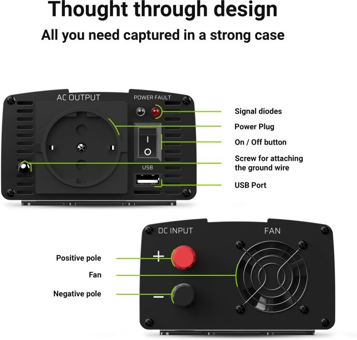 Invertor je zariadenie, ktoré mení jednosmerné napätie z autoakumulátora alebo autozapaľovača na striedavé ~230V. Presne rovnaký signál je v každej elektrickej zástrčke (typ F) v Európe.Vlastnosti