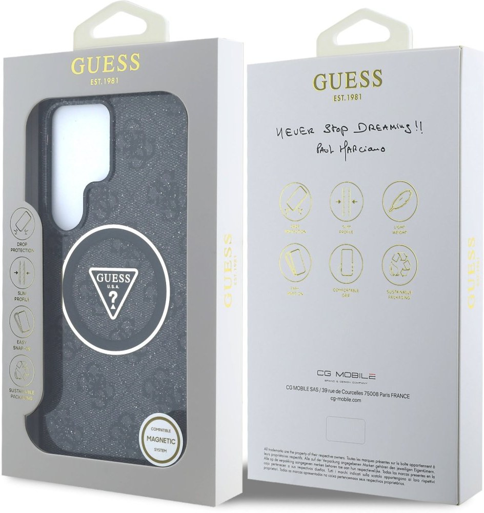 Guess IML 4G Glitter a Triangle Logo MagSafe zadný kryt na telefón je skvelým doplnkom pre všetkých milovníkov štýlu a praktickosti. Tento kryt je vyrobený z kombinácie pevného PC plastu na zadnej strane a TPU mäkkého plastu na bokoch, čo vytvára dokonalú symbiózu odolnosti a pohodlia. Vďaka presnému tvaru perfektne sedí na telefóne a umožňuje ľahký prístup ku všetkým tlačidlám a konektorom. Tento kryt podporuje technológiu MagSafe, čo znamená, že je kompatibilný s bezdrôtovým nabíjaním a ďalšími MagSafe doplnkami. Dizajn krytu vyniká triangle logom Guess v zlatom kruhu a motívom 4G s jemnými trblietkami na pozadí, čo z neho robí nielen praktický, ale aj štýlový doplnok, ktorý skvele doplní váš outfit. Pokiaľ hľadáte kryt, ktorý kombinuje eleganciu a funkčnosť, je tento kúsok od GUESS tou pravou voľbou pre vás.Vlastnosti