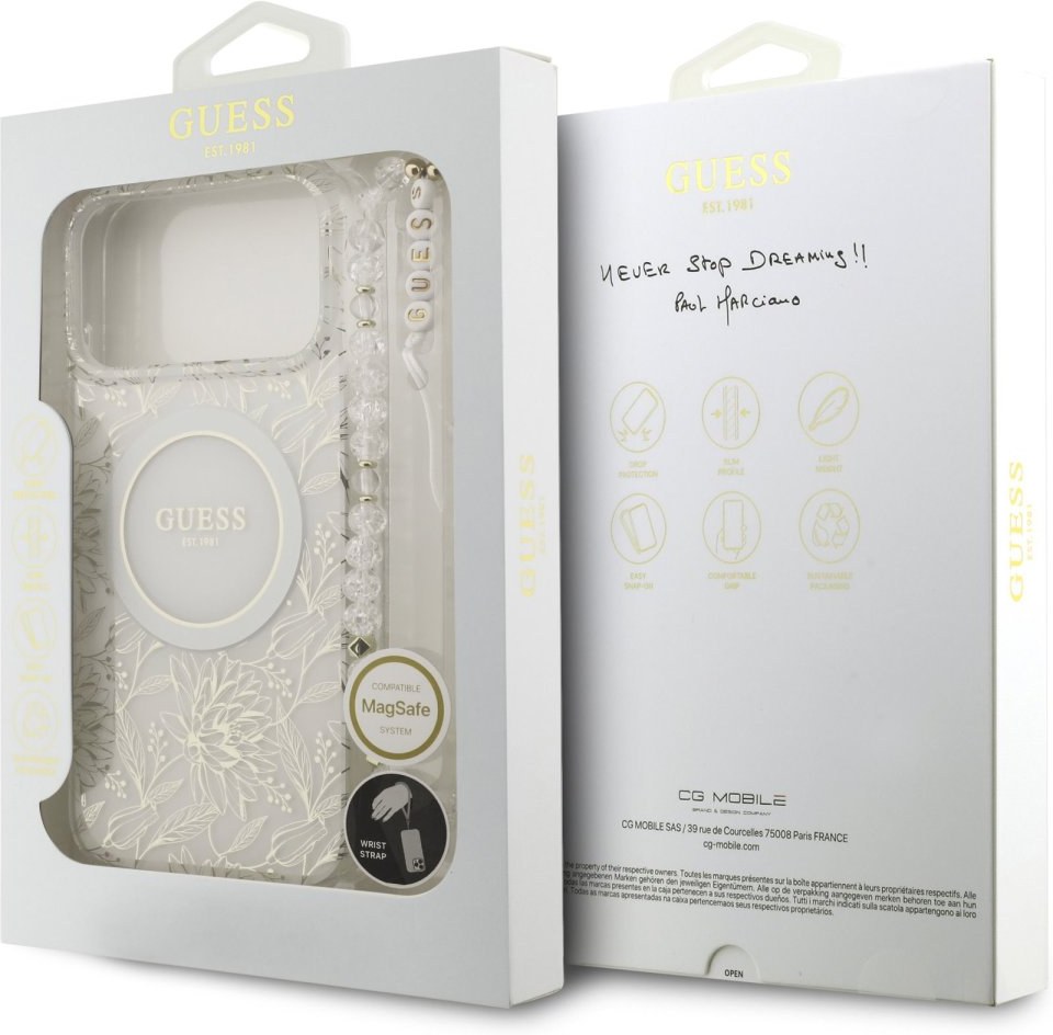 Guess IML Allover Pearl Strap MagSafe zadný kryt na telefón je skvelým doplnkom pre všetkých milovníkov štýlu a praktickosti. Tento kryt je vyrobený z kombinácie pevného PC plastu na zadnej strane a TPU mäkkého plastu na bokoch, čo vytvára dokonalú symbiózu odolnosti a pohodlia. Vďaka presnému tvaru perfektne sedí na telefóne a umožňuje ľahký prístup ku všetkým tlačidlám a konektorom. Tento kryt podporuje technológiu MagSafe, čo znamená, že je kompatibilný s bezdrôtovým nabíjaním a ďalšími MagSafe doplnkami. Dizajn krytu vyniká logom Guess v kruhu, čo z neho robí nielen praktický, ale aj štýlový doplnok, ktorý skvele doplní váš outfit. Súčasťou krytu je aj korálkové pútko, ktoré plní nielen estetickú funkciu, ale zaistí aj bezpečné držanie telefónu v ruke. Pokiaľ hľadáte kryt, ktorý kombinuje eleganciu a funkčnosť, je tento kúsok od GUESS tou pravou voľbou pre vás.Kľúčové vlastnosti
