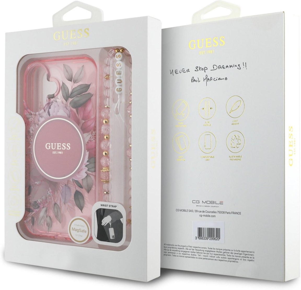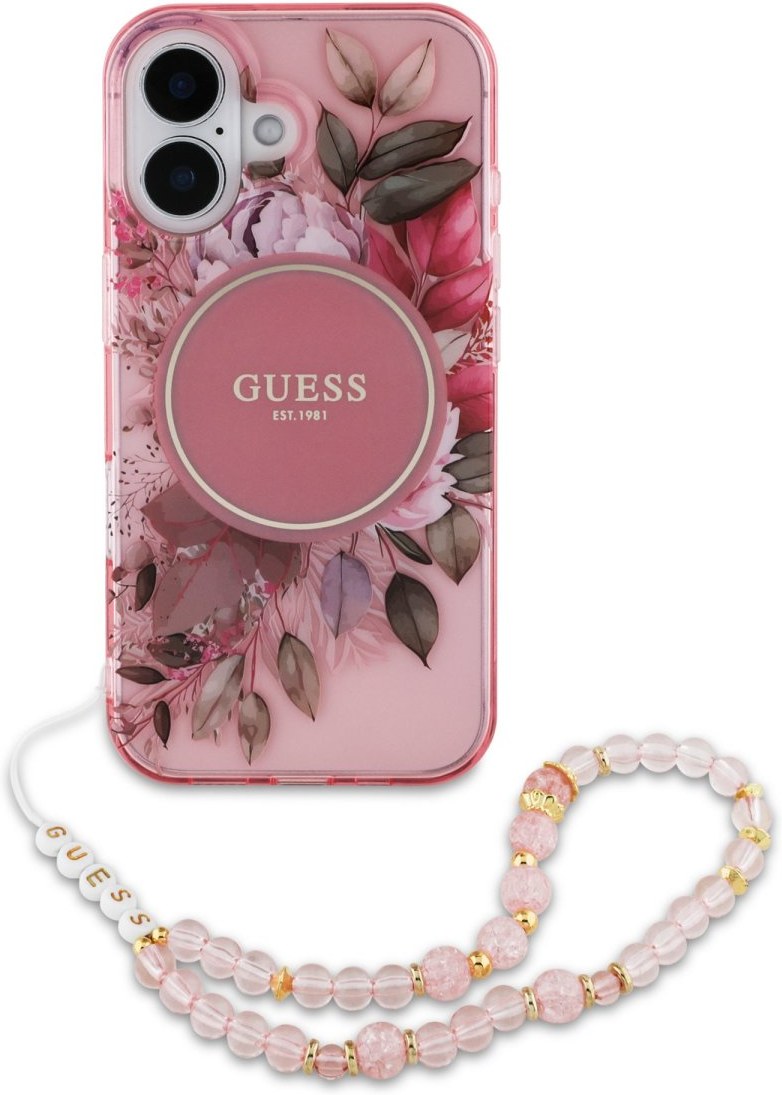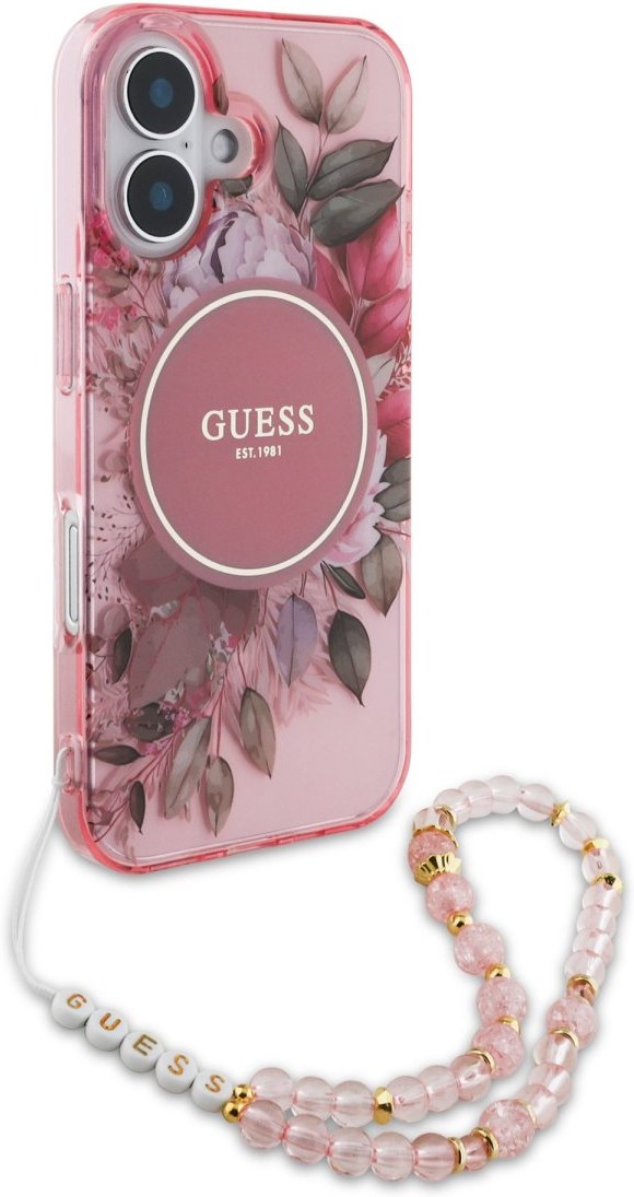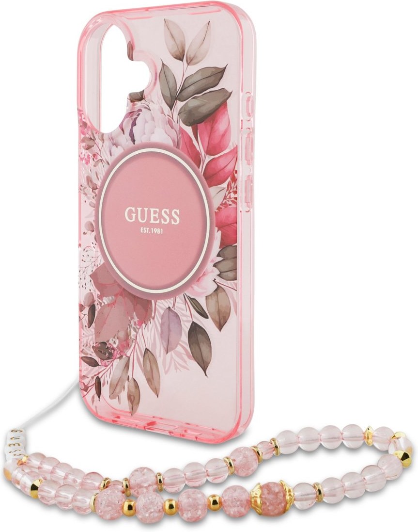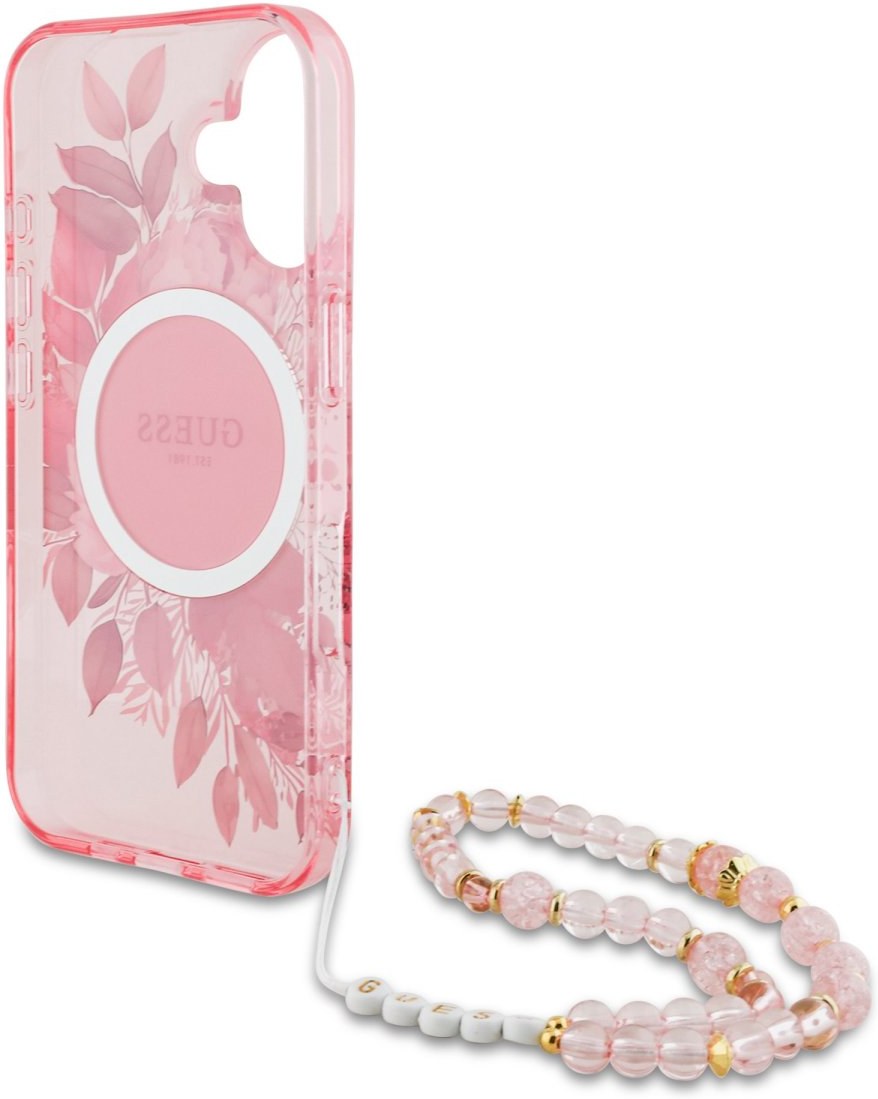 Guess IML Flowers Strap MagSafe kryt pre iPhone 16 Plus, ružový