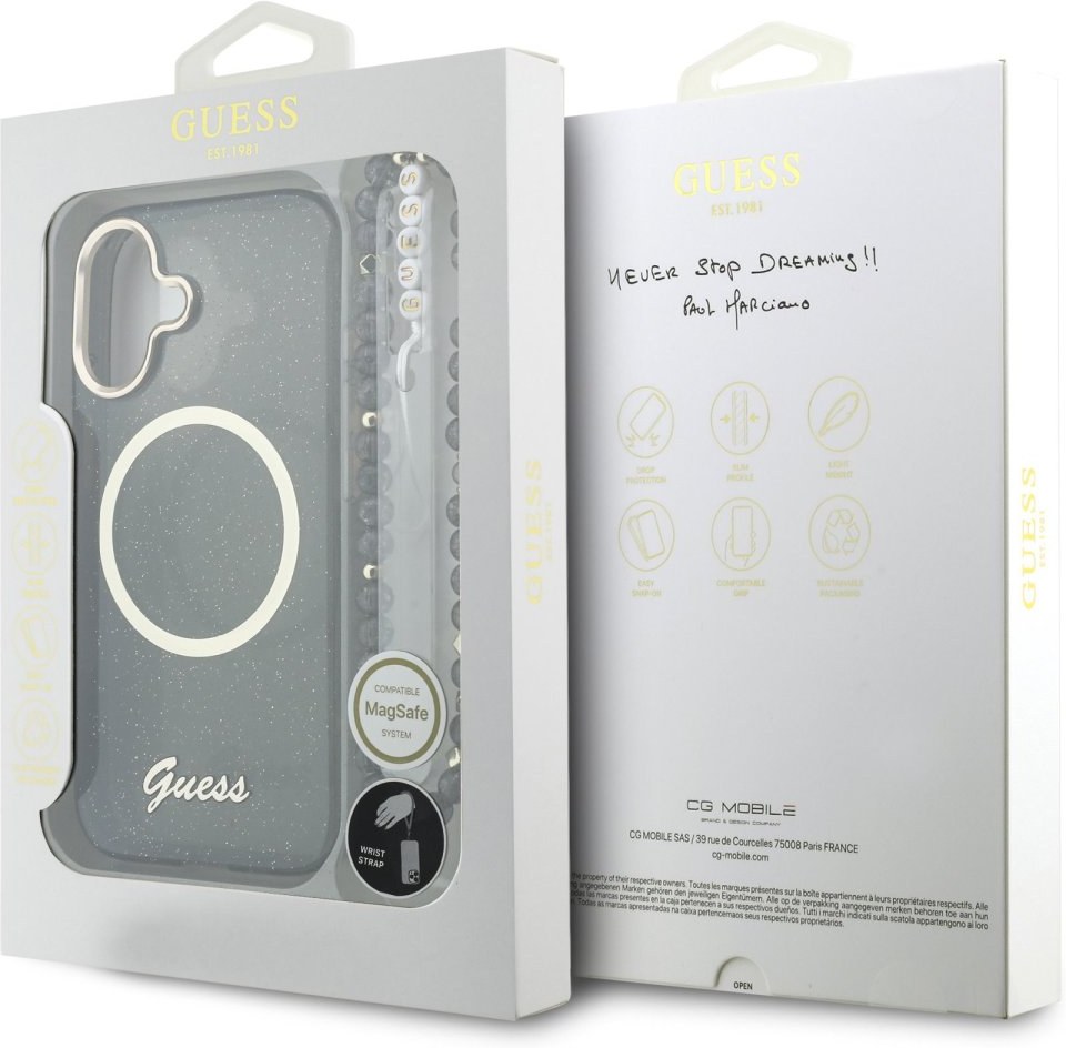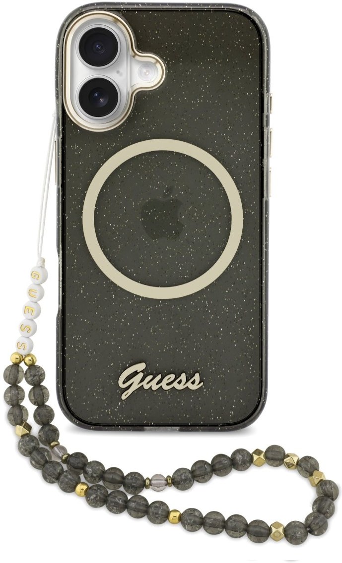 Guess IML Glitter Script Strap MagSafe zadný kryt na telefón je skvelým doplnkom pre všetkých milovníkov štýlu a praktickosti. Tento kryt je vyrobený z kombinácie pevného PC plastu na zadnej strane a TPU mäkkého plastu na bokoch, čo vytvára dokonalú symbiózu odolnosti a pohodlia. Vďaka presnému tvaru perfektne sedí na telefóne a umožňuje ľahký prístup ku všetkým tlačidlám a konektorom. Tento kryt podporuje technológiu MagSafe, čo znamená, že je kompatibilný s bezdrôtovým nabíjaním a ďalšími MagSafe doplnkami. Dizajn krytu vyniká logom Guess na zadnej strane a trblietavým lookom, čo z neho robí nielen praktický, ale aj štýlový doplnok, ktorý skvele doplní váš outfit. Súčasťou krytu je aj korálkové pútko, ktoré plní nielen estetickú funkciu, ale zaistí aj bezpečné držanie telefónu v ruke. Pokiaľ hľadáte kryt, ktorý kombinuje eleganciu a funkčnosť, je tento kúsok od GUESS tou pravou voľbou pre vás.Kľúčové vlastnosti