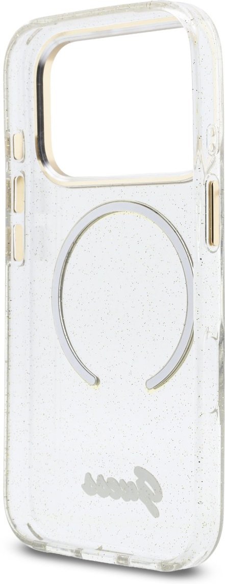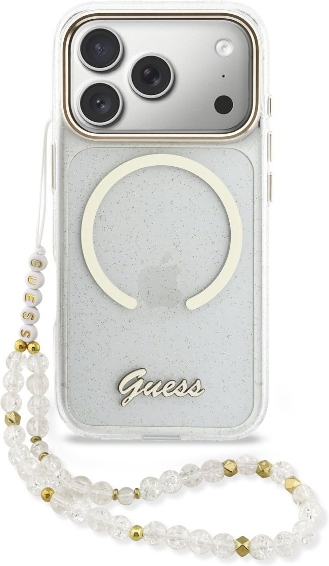 Guess IML Glitter Script Strap MagSafe kryt pre iPhone 17 Pro Max, transparentný