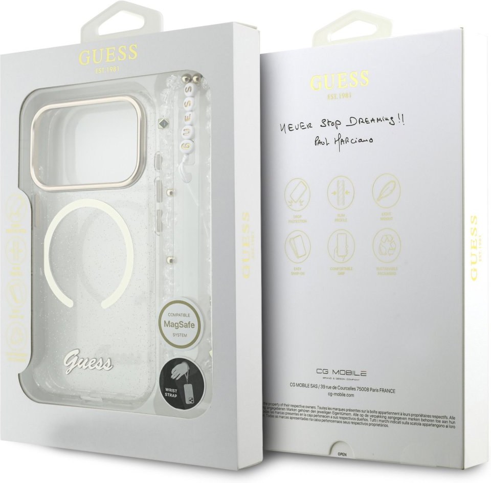 Guess IML Glitter Script Strap MagSafe kryt pre iPhone 17 Pro, transparentný