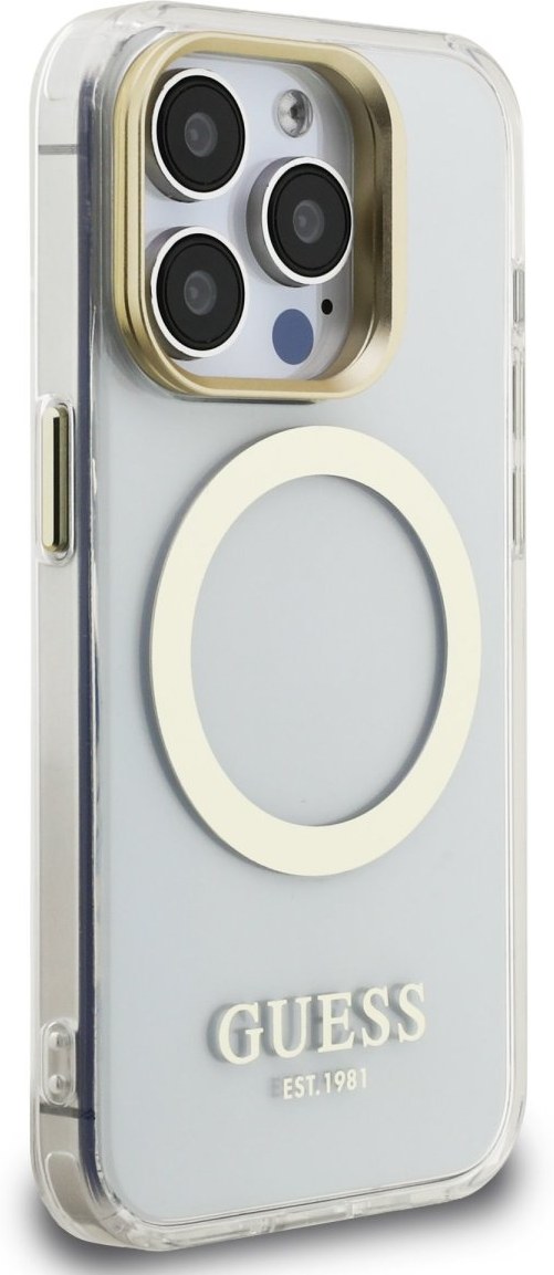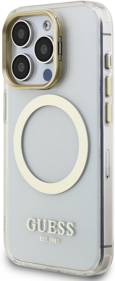 Guess IML Gold Outline Stand Camera Frame MagSafe kryt pre iPhone 15 Pro Max, transparentný