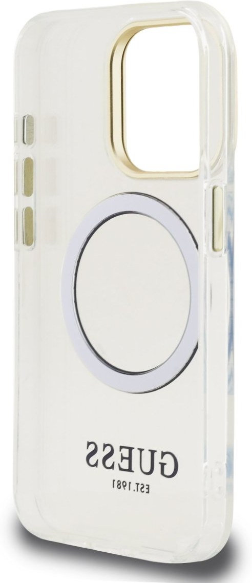 Guess IML Gold Outline Stand Camera Frame MagSafe zadný kryt na telefón je skvelým doplnkom pre všetkých milovníkov štýlu a praktickosti. Tento kryt je vyrobený z kombinácie pevného PC plastu na zadnej strane a TPU mäkkého plastu na bokoch, čo vytvára dokonalú symbiózu odolnosti a pohodlia. Vďaka presnému tvaru perfektne sedí na telefóne a umožňuje ľahký prístup ku všetkým tlačidlám a konektorom. Tento kryt podporuje technológiu MagSafe, čo znamená, že je kompatibilný s bezdrôtovým nabíjaním a ďalšími MagSafe doplnkami. Kryt je prakticky navrhnutý s integrovaným stojanom na zadnej strane, ktorý zároveň funguje ako ochranný rámček pre zadný fotoaparát. Vďaka stojanu si môžete telefón jednoducho postaviť na stôl a pohodlne sledovať filmy, videá, prezerať fotky alebo vybavovať videohovory - a to všetko bez nutnosti držať telefón v ruke. Dizajn krytu vyniká logom Guess na zadnej strane, čo z neho robí nielen praktický, ale aj štýlový doplnok, ktorý skvele doplní váš outfit. Pokiaľ hľadáte kryt, ktorý kombinuje eleganciu a funkčnosť, je tento kúsok od GUESS tou pravou voľbou pre vás.Kľúčové vlastnosti