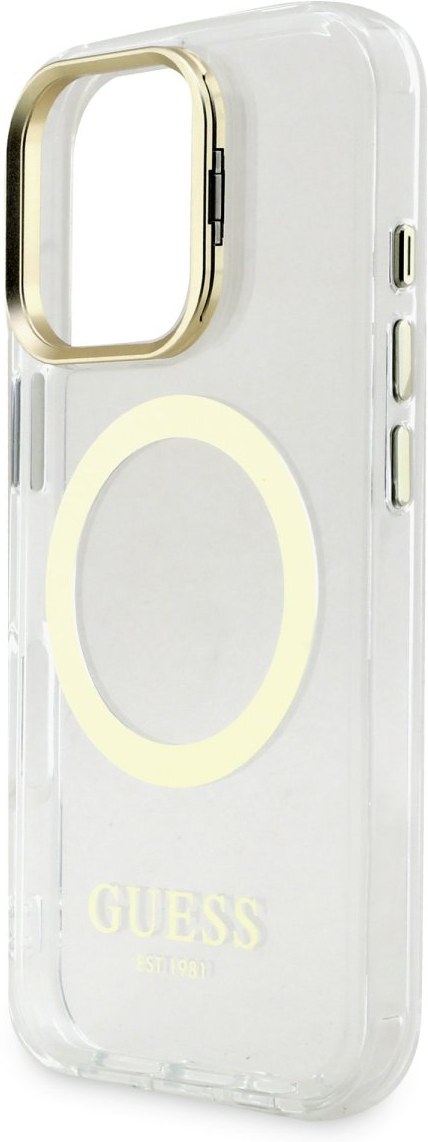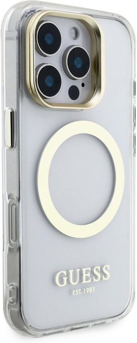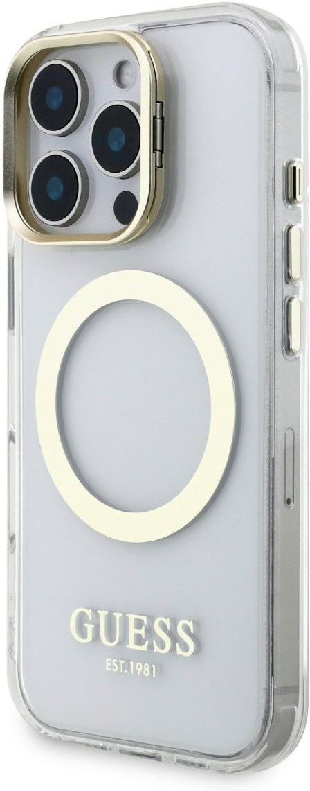Guess IML Gold Outline Stand Camera Frame MagSafe kryt pre iPhone 16 Pro Max, transparentný