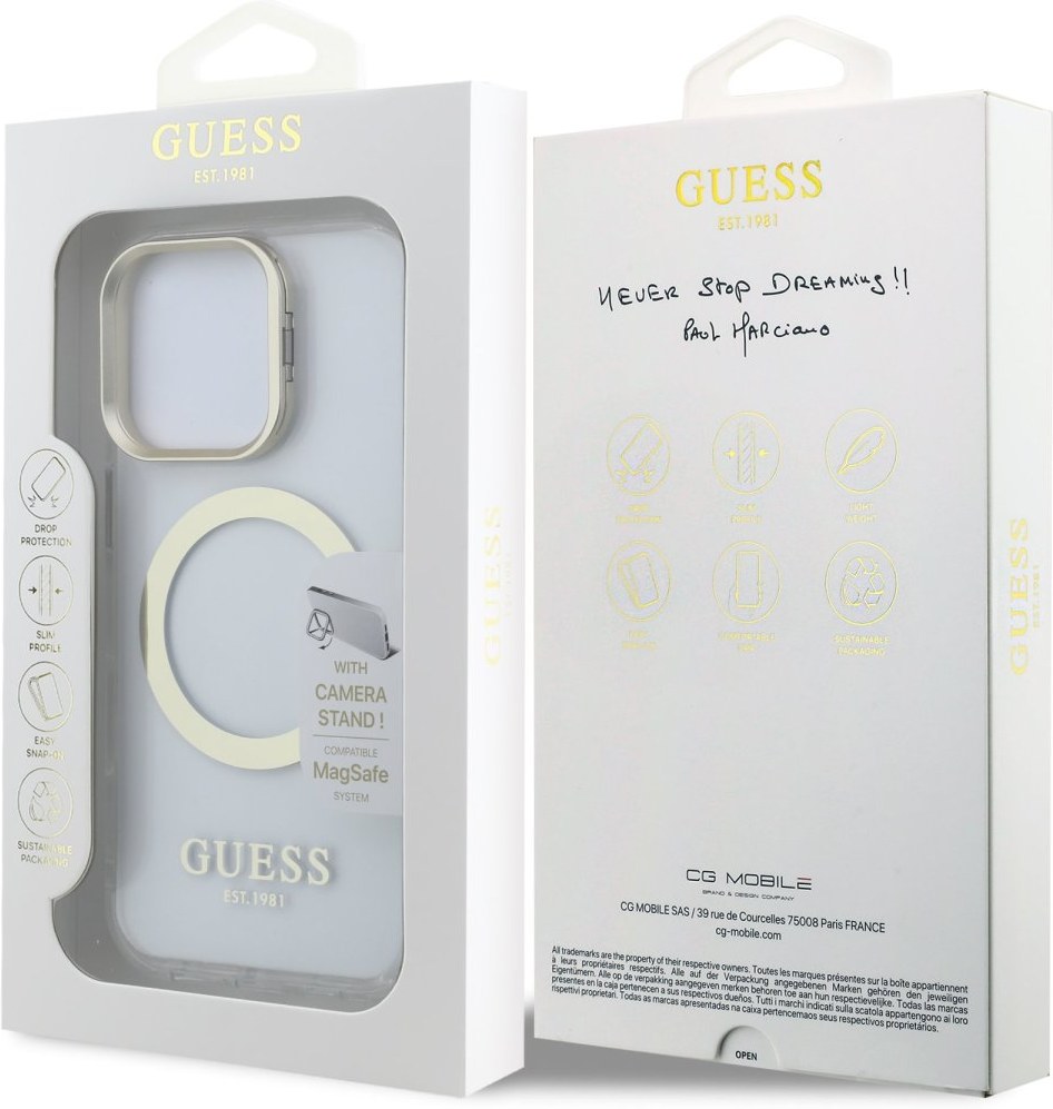 Guess IML Gold Outline Stand Camera Frame MagSafe zadný kryt na telefón je skvelým doplnkom pre všetkých milovníkov štýlu a praktickosti. Tento kryt je vyrobený z kombinácie pevného PC plastu na zadnej strane a TPU mäkkého plastu na bokoch, čo vytvára dokonalú symbiózu odolnosti a pohodlia. Vďaka presnému tvaru perfektne sedí na telefóne a umožňuje ľahký prístup ku všetkým tlačidlám a konektorom. Tento kryt podporuje technológiu MagSafe, čo znamená, že je kompatibilný s bezdrôtovým nabíjaním a ďalšími MagSafe doplnkami. Kryt je prakticky navrhnutý s integrovaným stojanom na zadnej strane, ktorý zároveň funguje ako ochranný rámček pre zadný fotoaparát. Vďaka stojanu si môžete telefón jednoducho postaviť na stôl a pohodlne sledovať filmy, videá, prezerať fotky alebo vybavovať videohovory - a to všetko bez nutnosti držať telefón v ruke. Dizajn krytu vyniká logom Guess na zadnej strane, čo z neho robí nielen praktický, ale aj štýlový doplnok, ktorý skvele doplní váš outfit. Pokiaľ hľadáte kryt, ktorý kombinuje eleganciu a funkčnosť, je tento kúsok od GUESS tou pravou voľbou pre vás.Kľúčové vlastnosti