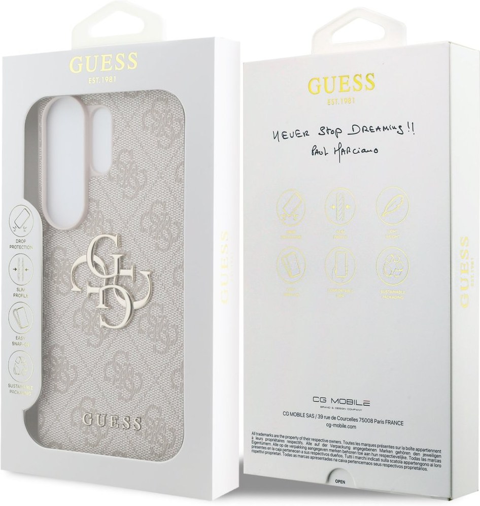 Prémiový zadný kryt Guess PU 4G Metal Logo sa vyznačuje elegantným, charakteristickým 4G vzorom, doplneným o logo GUESS. Kryt je vyrobený z ľahkého a odolného polyuretánu (PU) s povrchovou úpravou z PU kože a ponúka tak nielen skvelú ochranu telefónu, ale aj pohodlie pri používaní. Táto povrchová úprava zaisťuje pevný úchop, čo minimalizuje riziko, že telefón vykĺzne z ruky. Vďaka presnému tvaru perfektne sedí na telefóne a umožňuje ľahký prístup ku všetkým tlačidlám a konektorom. Tento prvotriedny kryt doplnený výrazným 4G logom a je skvelou ponukou pre ľudí, ktorí si v móde cenia nielen exkluzívneho vzhľadu, ale aj vysokej kvality a funkčnosti. Je to nevyhnutný doplnok pre každého, kto hľadá kombináciu elegancie a prestíže.Kľúčové vlastnosti
