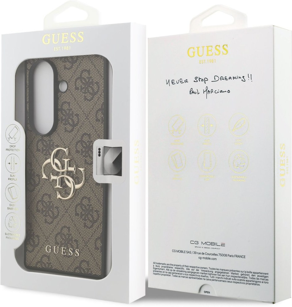 Prémiový zadný kryt Guess PU 4G Metal Logo sa vyznačuje elegantným, charakteristickým 4G vzorom, doplneným o logo GUESS. Kryt je vyrobený z ľahkého a odolného polyuretánu (PU) s povrchovou úpravou z PU kože a ponúka tak nielen skvelú ochranu telefónu, ale aj pohodlie pri používaní. Táto povrchová úprava zaisťuje pevný úchop, čo minimalizuje riziko, že telefón vykĺzne z ruky. Vďaka presnému tvaru perfektne sedí na telefóne a umožňuje ľahký prístup ku všetkým tlačidlám a konektorom. Tento prvotriedny kryt doplnený výrazným 4G logom a je skvelou ponukou pre ľudí, ktorí si v móde cenia nielen exkluzívneho vzhľadu, ale aj vysokej kvality a funkčnosti. Je to nevyhnutný doplnok pre každého, kto hľadá kombináciu elegancie a prestíže.Kľúčové vlastnosti
