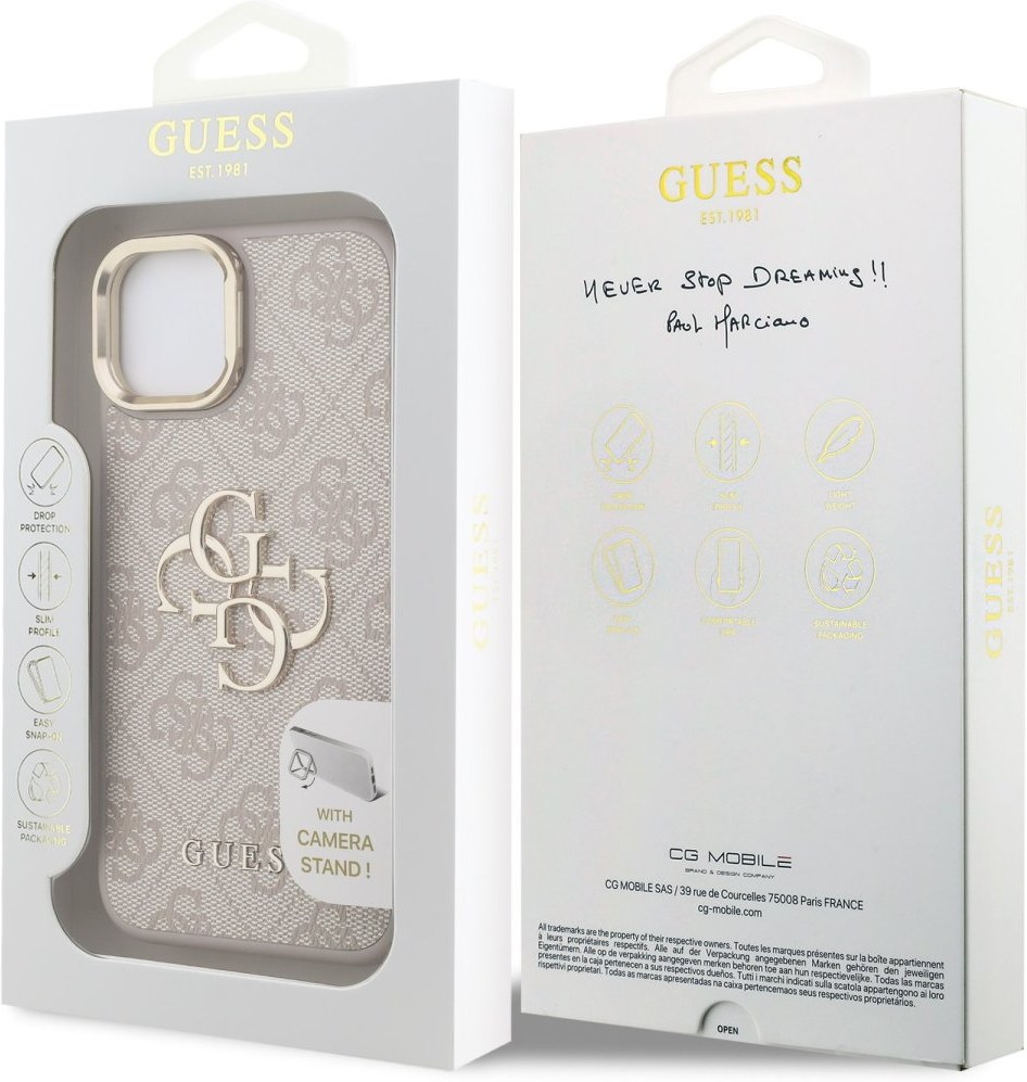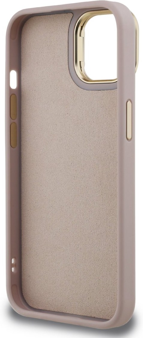 Guess PU 4G Metal Logo Stand Camera Frame kryt pre iPhone 13, ružový
