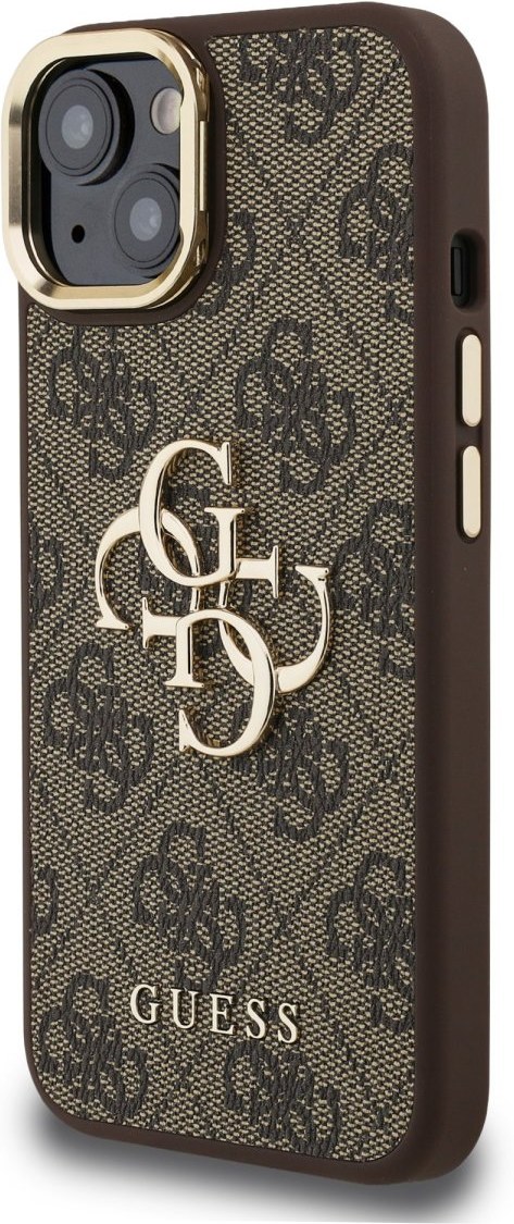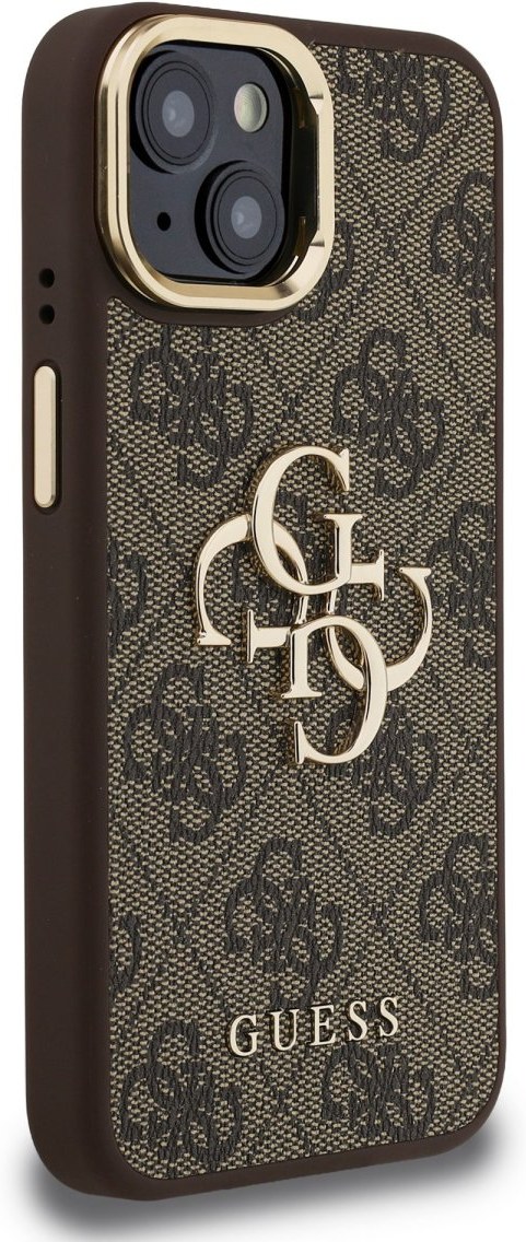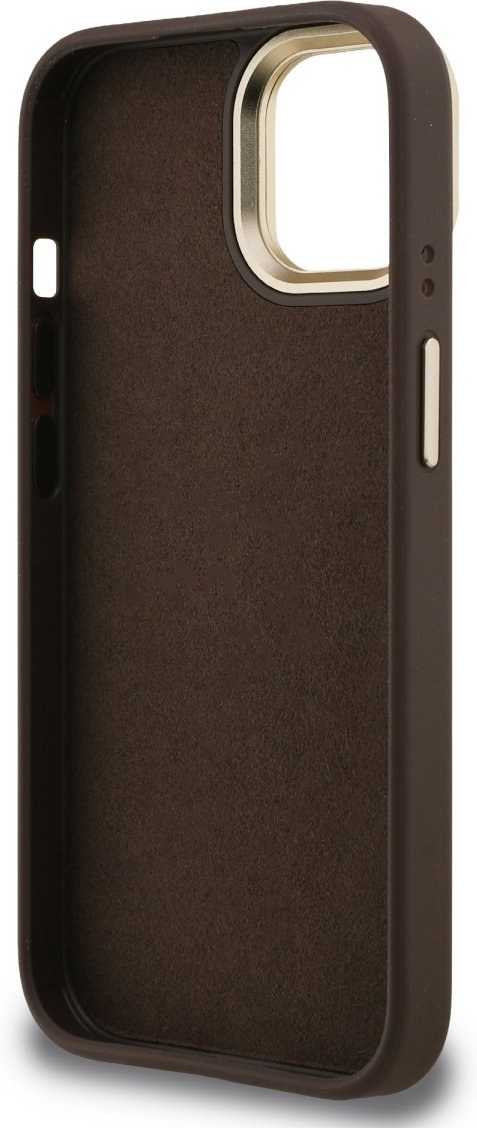 Guess PU 4G Metal Logo Stand Camera Frame kryt pre iPhone 15, hnedý