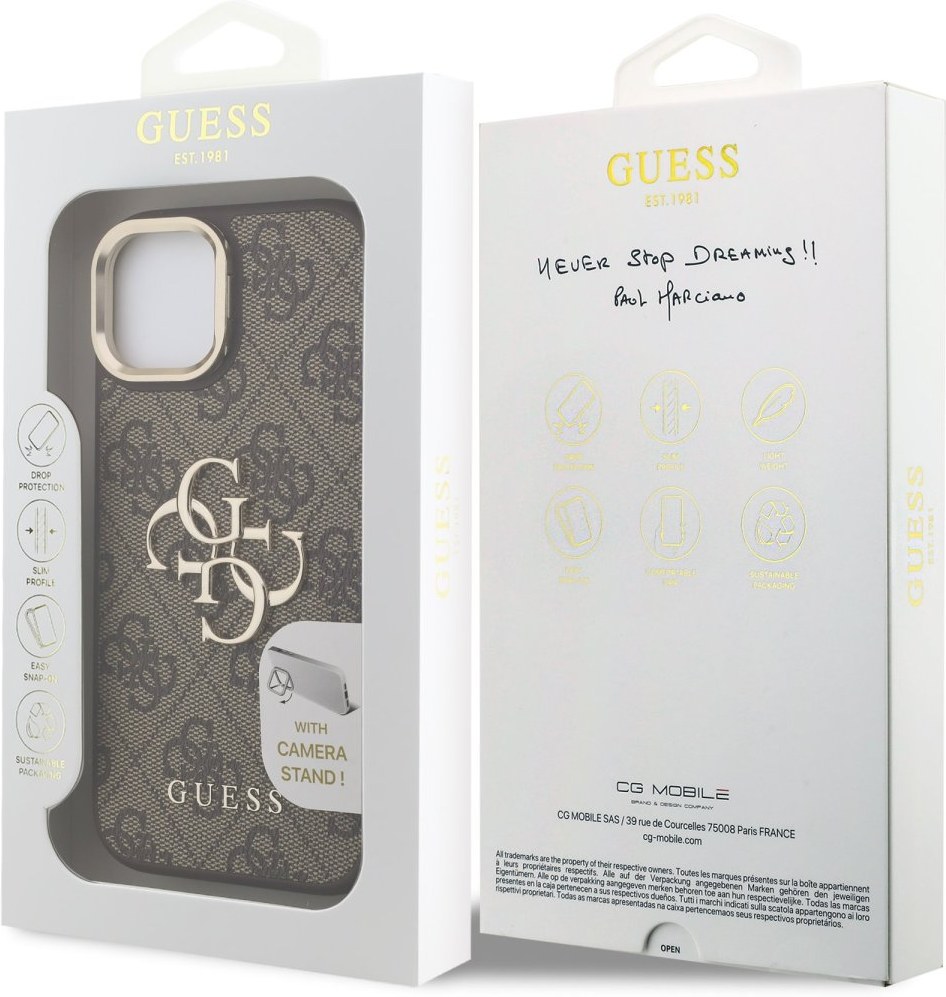 Prémiový zadný kryt Guess PU 4G Metal Logo Stand Camera Frame sa vyznačuje elegantným, charakteristickým 4G vzorom, doplneným o logo GUESS. Kryt je vyrobený z ľahkého a odolného polyuretánu (PU) s povrchovou úpravou z PU kože a ponúka tak nielen skvelú ochranu telefónu, ale aj pohodlie pri používaní. Táto povrchová úprava zaisťuje pevný úchop, čo minimalizuje riziko, že telefón vykĺzne z ruky. Vďaka presnému tvaru perfektne sedí na telefóne a umožňuje ľahký prístup ku všetkým tlačidlám a konektorom. Tento kryt je prakticky navrhnutý s integrovaným stojanom na zadnej strane, ktorý zároveň funguje ako ochranný rámček pre zadný fotoaparát. Vďaka stojanu si môžete telefón jednoducho postaviť na stôl a pohodlne sledovať filmy, videá, prezerať fotky alebo vybavovať videohovory - a to všetko bez nutnosti držať telefón v ruke. Tento prvotriedny kryt doplnený výrazným 4G logom a je skvelou ponukou pre ľudí, ktorí si v móde cenia nielen exkluzívneho vzhľadu, ale aj vysokej kvality a funkčnosti. Je to nevyhnutný doplnok pre každého, kto hľadá kombináciu elegancie a prestíže.Vlastnosti