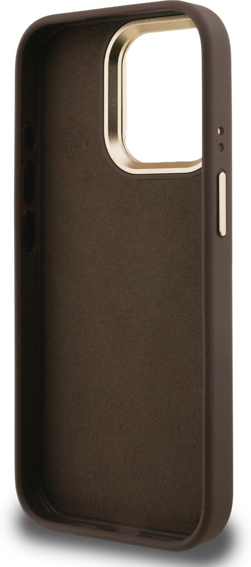 Guess PU 4G Metal Logo Stand Camera Frame kryt pre iPhone 15 Pro, hnedý