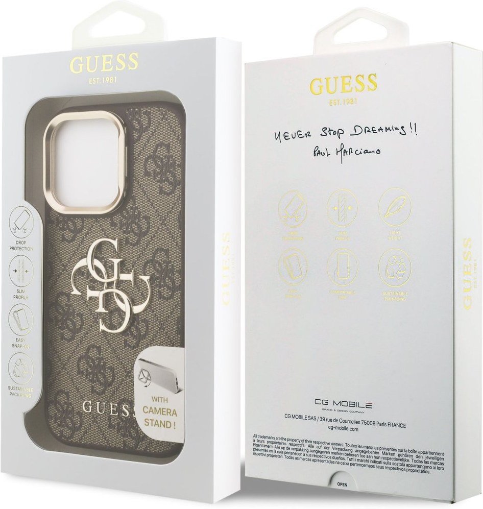 Prémiový zadný kryt Guess PU 4G Metal Logo Stand Camera Frame sa vyznačuje elegantným, charakteristickým 4G vzorom, doplneným o logo GUESS. Kryt je vyrobený z ľahkého a odolného polyuretánu (PU) s povrchovou úpravou z PU kože a ponúka tak nielen skvelú ochranu telefónu, ale aj pohodlie pri používaní. Táto povrchová úprava zaisťuje pevný úchop, čo minimalizuje riziko, že telefón vykĺzne z ruky. Vďaka presnému tvaru perfektne sedí na telefóne a umožňuje ľahký prístup ku všetkým tlačidlám a konektorom. Tento kryt je prakticky navrhnutý s integrovaným stojanom na zadnej strane, ktorý zároveň funguje ako ochranný rámček pre zadný fotoaparát. Vďaka stojanu si môžete telefón jednoducho postaviť na stôl a pohodlne sledovať filmy, videá, prezerať fotky alebo vybavovať videohovory - a to všetko bez nutnosti držať telefón v ruke. Tento prvotriedny kryt doplnený výrazným 4G logom a je skvelou ponukou pre ľudí, ktorí si v móde cenia nielen exkluzívneho vzhľadu, ale aj vysokej kvality a funkčnosti. Je to nevyhnutný doplnok pre každého, kto hľadá kombináciu elegancie a prestíže.Vlastnosti