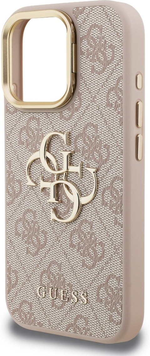 Guess PU 4G Metal Logo Stand Camera Frame kryt pre iPhone 15 Pro, ružový