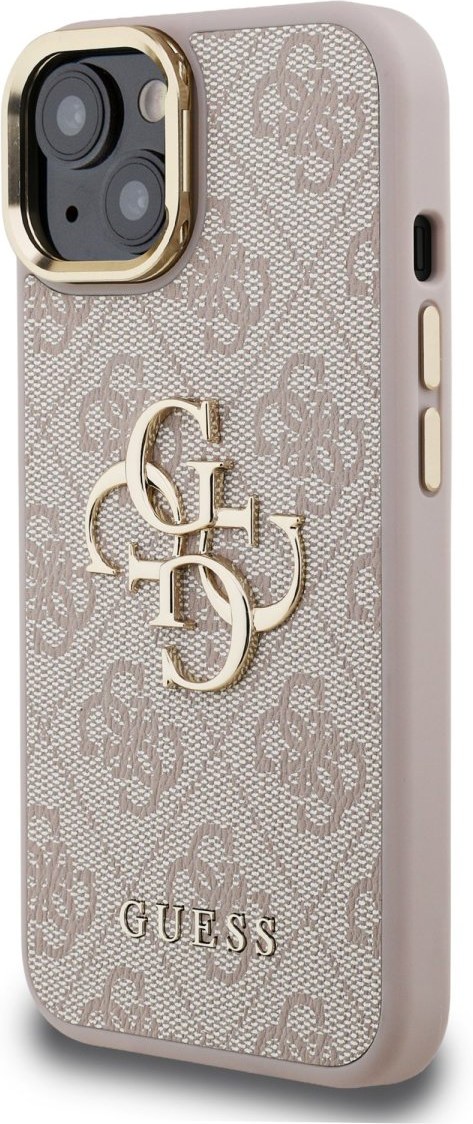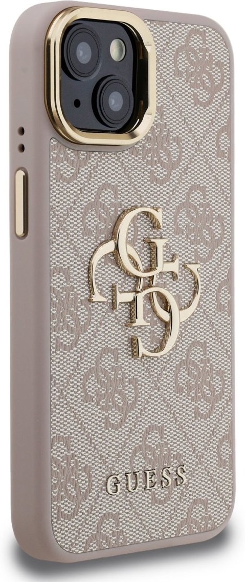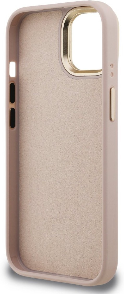Guess PU 4G Metal Logo Stand Camera Frame kryt pre iPhone 15, ružový