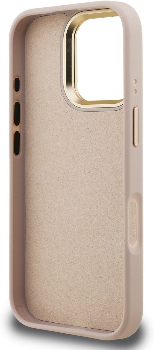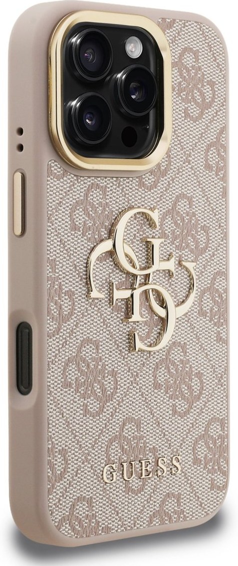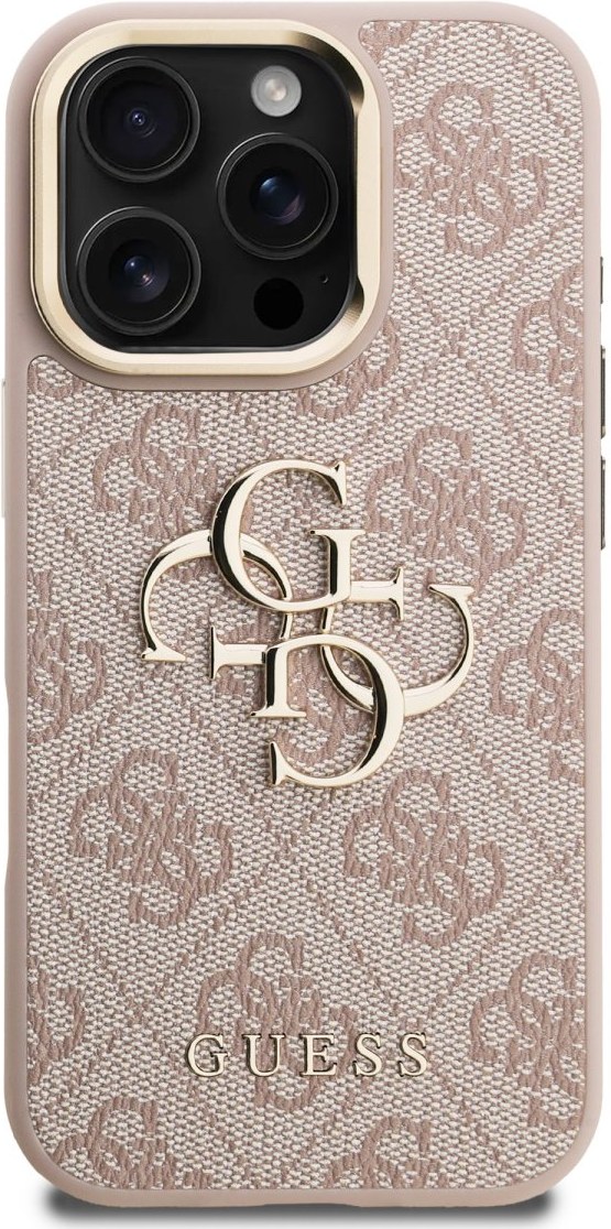 Guess PU 4G Metal Logo Stand Camera Frame kryt pre iPhone 16 Pro Max, ružový