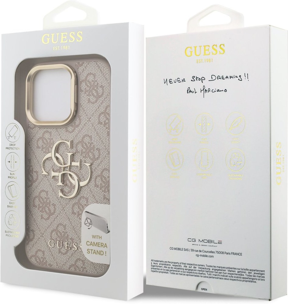 Prémiový zadný kryt Guess PU 4G Metal Logo Stand Camera Frame sa vyznačuje elegantným, charakteristickým 4G vzorom, doplneným o logo GUESS. Kryt je vyrobený z ľahkého a odolného polyuretánu (PU) s povrchovou úpravou z PU kože a ponúka tak nielen skvelú ochranu telefónu, ale aj pohodlie pri používaní. Táto povrchová úprava zaisťuje pevný úchop, čo minimalizuje riziko, že telefón vykĺzne z ruky. Vďaka presnému tvaru perfektne sedí na telefóne a umožňuje ľahký prístup ku všetkým tlačidlám a konektorom. Tento kryt je prakticky navrhnutý s integrovaným stojanom na zadnej strane, ktorý zároveň funguje ako ochranný rámček pre zadný fotoaparát. Vďaka stojanu si môžete telefón jednoducho postaviť na stôl a pohodlne sledovať filmy, videá, prezerať fotky alebo vybavovať videohovory - a to všetko bez nutnosti držať telefón v ruke. Tento prvotriedny kryt doplnený výrazným 4G logom a je skvelou ponukou pre ľudí, ktorí si v móde cenia nielen exkluzívneho vzhľadu, ale aj vysokej kvality a funkčnosti. Je to nevyhnutný doplnok pre každého, kto hľadá kombináciu elegancie a prestíže.Vlastnosti