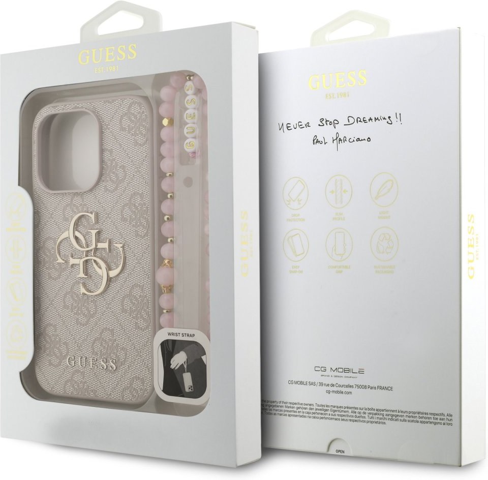 Prémiový zadný kryt Guess PU 4G Metal Logo Strap sa vyznačuje elegantným, charakteristickým 4G vzorom, doplneným o logo GUESS. Kryt je vyrobený z ľahkého a odolného polyuretánu (PU) s povrchovou úpravou z PU kože a ponúka tak nielen skvelú ochranu telefónu, ale aj pohodlie pri používaní. Táto povrchová úprava zaisťuje pevný úchop, čo minimalizuje riziko, že telefón vykĺzne z ruky. Vďaka presnému tvaru perfektne sedí na telefóne a umožňuje ľahký prístup ku všetkým tlačidlám a konektorom. Tento prvotriedny kryt doplnený výrazným 4G logom a je skvelou ponukou pre ľudí, ktorí si v móde cenia nielen exkluzívneho vzhľadu, ale aj vysokej kvality a funkčnosti. Kryt je doplnený elegantným koralovým pútkom, ktorý môžete nasadiť na zápästie, aby vám telefón nevykĺzol z ruky. To vám zaručí bezpečné manipulovanie s vaším zariadením. Je to nevyhnutný doplnok pre každého, kto hľadá kombináciu elegancie a prestíže.Vlastnosti