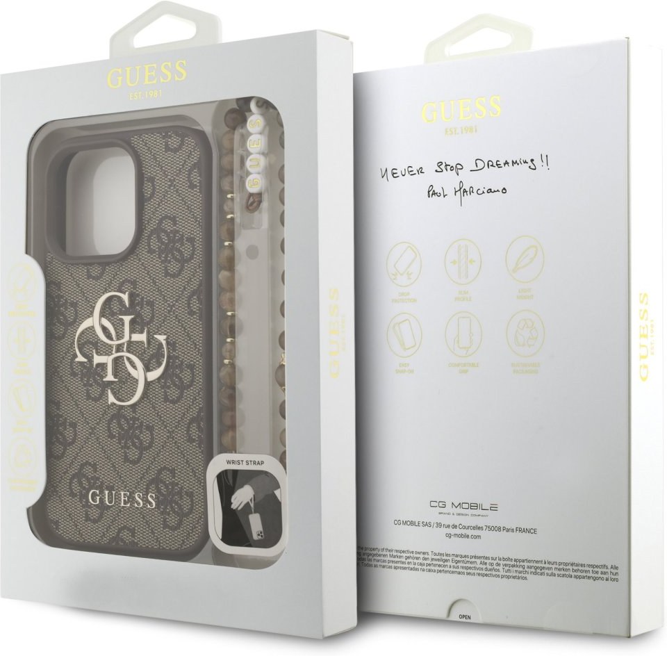 Prémiový zadný kryt Guess PU 4G Metal Logo Strap sa vyznačuje elegantným, charakteristickým 4G vzorom, doplneným o logo GUESS. Kryt je vyrobený z ľahkého a odolného polyuretánu (PU) s povrchovou úpravou z PU kože a ponúka tak nielen skvelú ochranu telefónu, ale aj pohodlie pri používaní. Táto povrchová úprava zaisťuje pevný úchop, čo minimalizuje riziko, že telefón vykĺzne z ruky. Vďaka presnému tvaru perfektne sedí na telefóne a umožňuje ľahký prístup ku všetkým tlačidlám a konektorom. Tento prvotriedny kryt doplnený výrazným 4G logom a je skvelou ponukou pre ľudí, ktorí si v móde cenia nielen exkluzívneho vzhľadu, ale aj vysokej kvality a funkčnosti. Kryt je doplnený elegantným koralovým pútkom, ktorý môžete nasadiť na zápästie, aby vám telefón nevykĺzol z ruky. To vám zaručí bezpečné manipulovanie s vaším zariadením. Je to nevyhnutný doplnok pre každého, kto hľadá kombináciu elegancie a prestíže.Vlastnosti