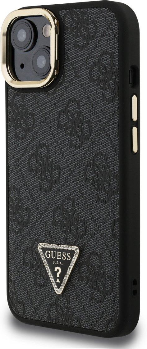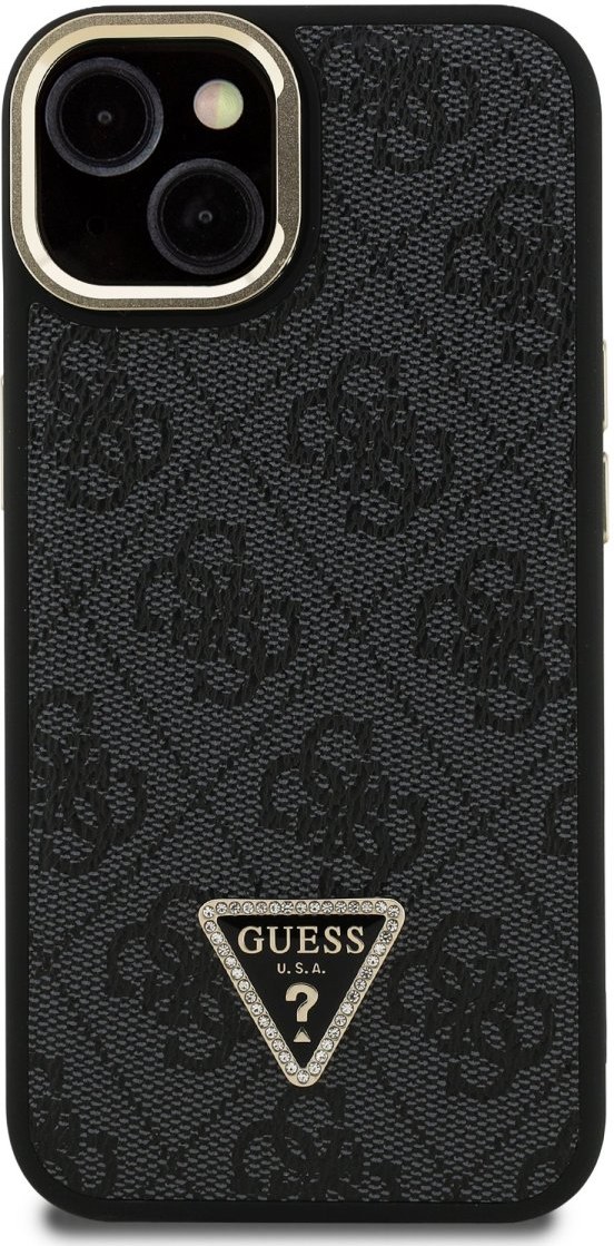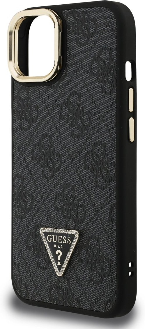 Guess PU 4G Strass Triangle Logo Stand Camera Frame MagSafe kryt pre iPhone 13, čierny