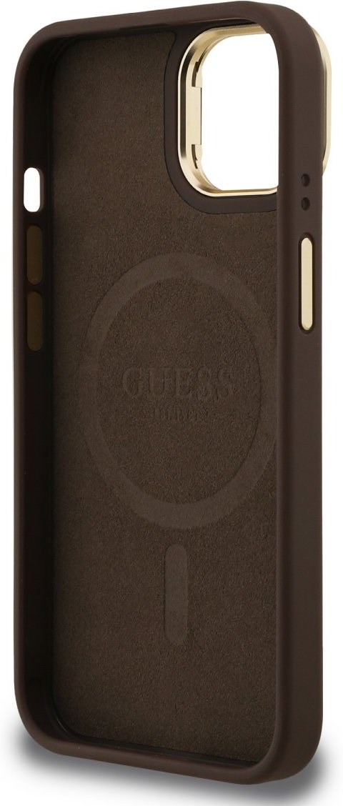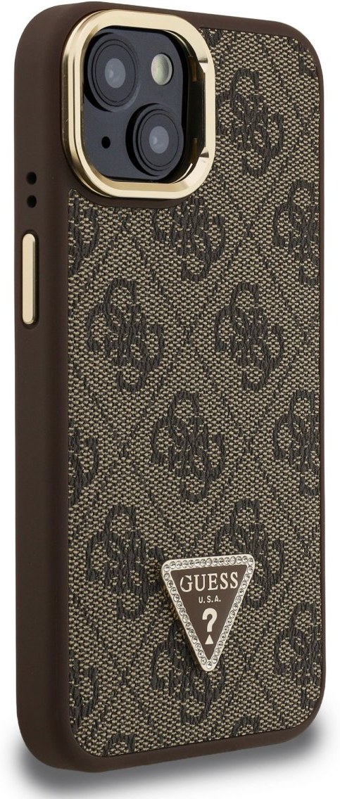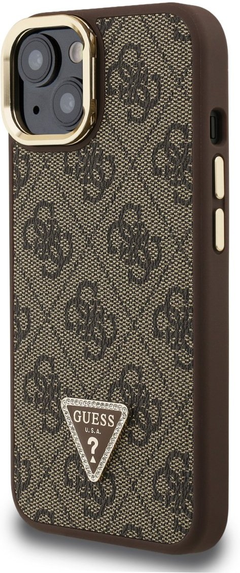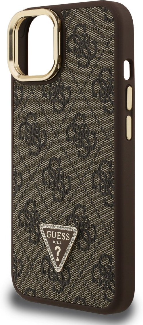 Guess PU 4G Strass Triangle Logo Stand Camera Frame MagSafe kryt pre iPhone 15, hnedý