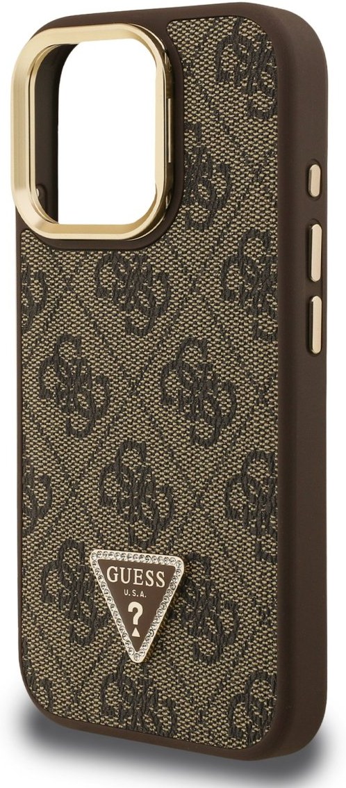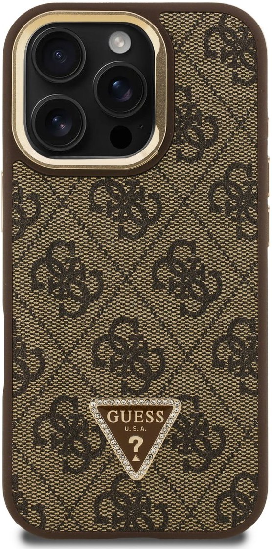 Guess PU 4G Strass Triangle Logo Stand Camera Frame MagSafe kryt pre iPhone 16 Pro Max, hnedý