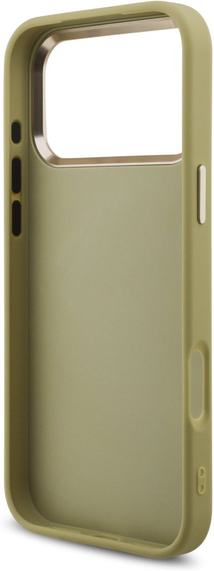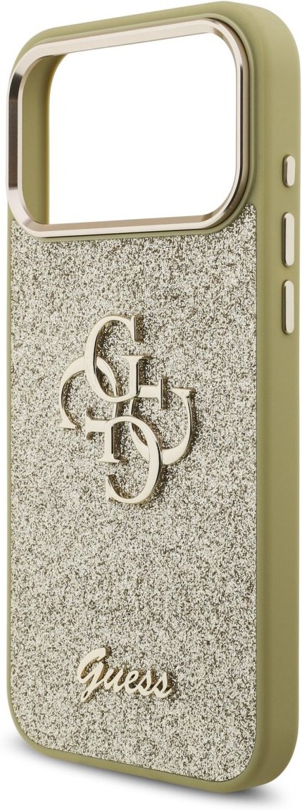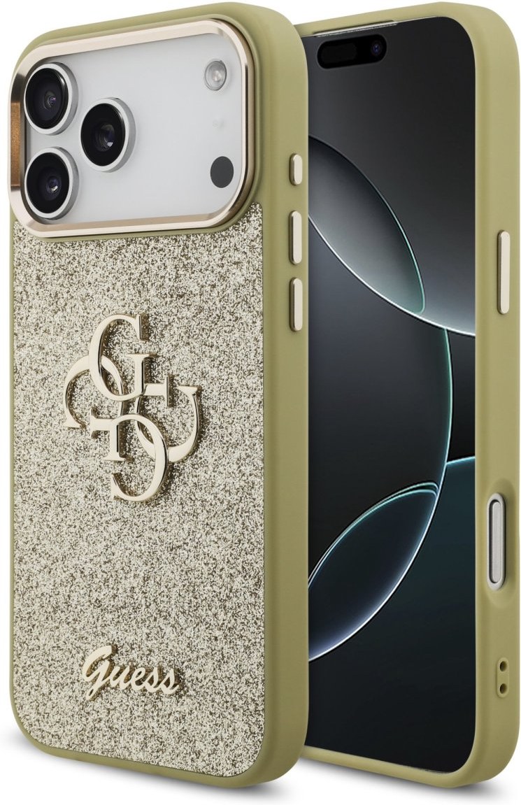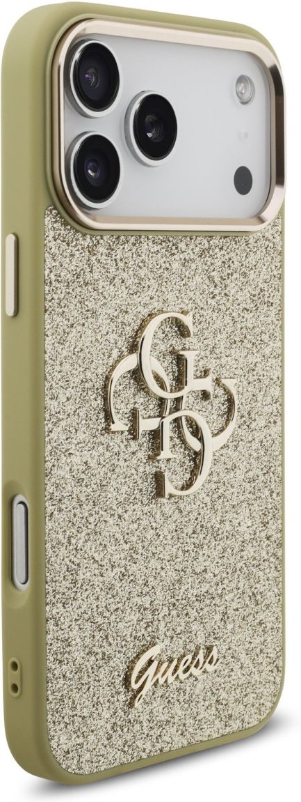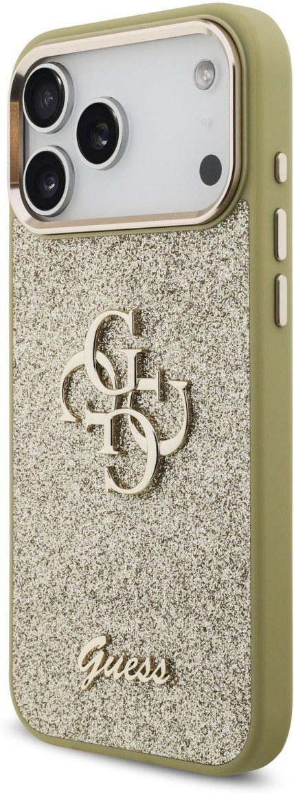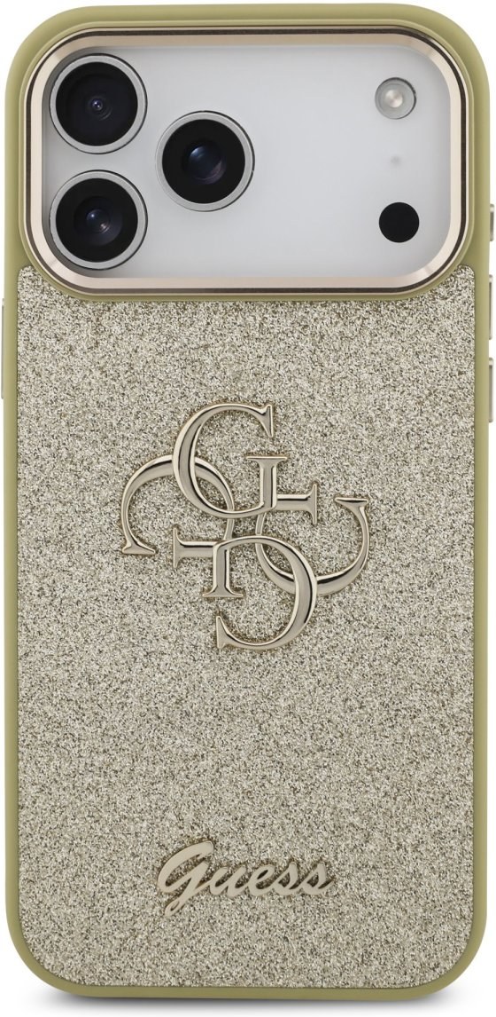 Guess PU Fixed Glitter 4G Metal Frame kryt pre iPhone 17 Pro Max, zlatý