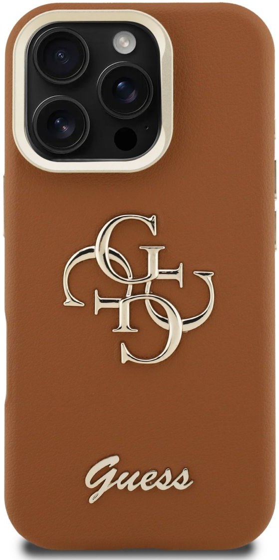 Guess PU Grained 4G Logo Stand Camera Frame kryt pre iPhone 16 Pro Max, hnedý