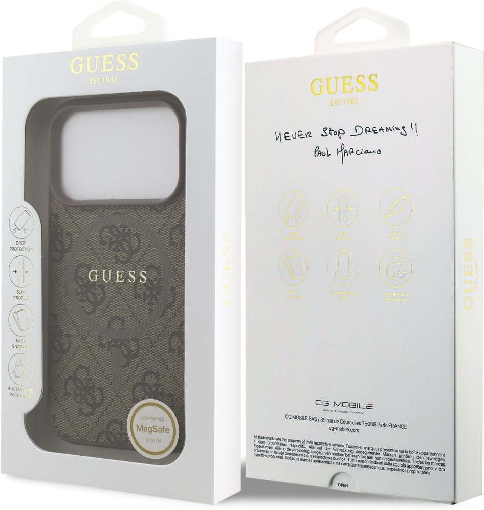 Guess PU Leather 4G Colored Ring MagSafe zadný kryt je dokonalý doplnok pre váš telefón aj váš outfit, ktorý kombinuje funkčnosť a štýl v jednom. Je vyrobený z ľahkej a odolnej PU umelej kože a ponúka skvelú ochranu telefónu aj pohodlia pri používaní. Povrchová úprava krytu zaisťuje, že sa skvele drží v ruke a nešmýka sa, čo minimalizuje riziko vykĺznutia telefónu. Vďaka presnému tvaru perfektne sedí na telefóne a umožňuje ľahký prístup ku všetkým tlačidlám a konektorom. Tento kryt podporuje technológiu MagSafe, čo znamená, že je kompatibilný s bezdrôtovým nabíjaním a ďalšími MagSafe doplnkami. Guess „4G“ elegantná potlač a kovové logo ponúka nielen decentný, ale aj luxusný vzhľad. Pokiaľ teda hľadáte kryt, ktorý kombinuje eleganciu a funkčnosť, je tento kúsok od Guess tou pravou voľbou pre vás.Kľúčové vlastnosti
