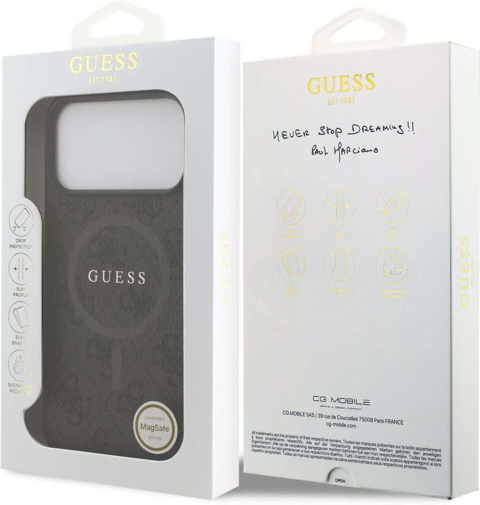 Guess PU Leather 4G Colored Ring MagSafe zadný kryt je dokonalý doplnok pre váš telefón aj váš outfit, ktorý kombinuje funkčnosť a štýl v jednom. Je vyrobený z ľahkej a odolnej PU umelej kože a ponúka skvelú ochranu telefónu aj pohodlia pri používaní. Povrchová úprava krytu zaisťuje, že sa skvele drží v ruke a nešmýka sa, čo minimalizuje riziko vykĺznutia telefónu. Vďaka presnému tvaru perfektne sedí na telefóne a umožňuje ľahký prístup ku všetkým tlačidlám a konektorom. Tento kryt podporuje technológiu MagSafe, čo znamená, že je kompatibilný s bezdrôtovým nabíjaním a ďalšími MagSafe doplnkami. Guess „4G“ elegantná potlač a kovové logo ponúka nielen decentný, ale aj luxusný vzhľad. Pokiaľ teda hľadáte kryt, ktorý kombinuje eleganciu a funkčnosť, je tento kúsok od Guess tou pravou voľbou pre vás.Kľúčové vlastnosti
