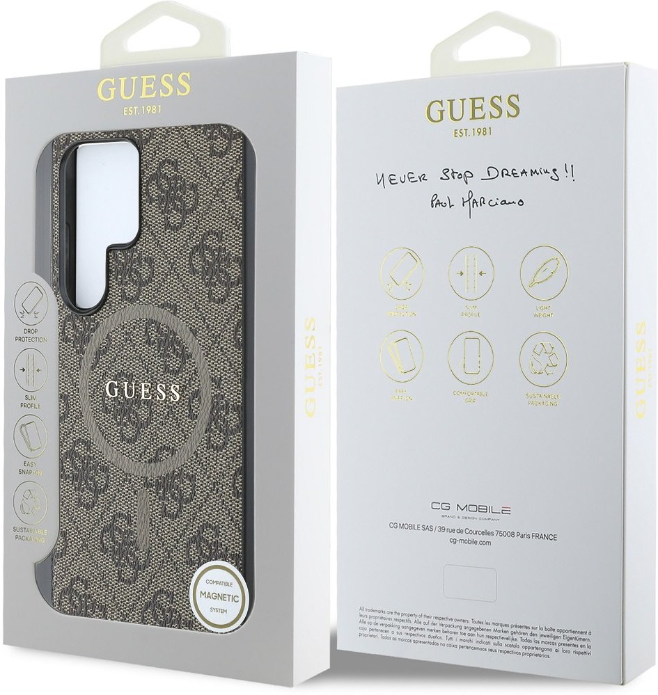 Guess PU Leather 4G Colored Ring MagSafe zadný kryt je dokonalý doplnok pre váš telefón aj váš outfit, ktorý kombinuje funkčnosť a štýl v jednom. Je vyrobený z ľahkej a odolnej PU umelej kože a ponúka skvelú ochranu telefónu aj pohodlia pri používaní. Povrchová úprava krytu zaisťuje, že sa skvele drží v ruke a nešmýka sa, čo minimalizuje riziko vykĺznutia telefónu. Vďaka presnému tvaru perfektne sedí na telefóne a umožňuje ľahký prístup ku všetkým tlačidlám a konektorom. Tento kryt podporuje technológiu MagSafe, čo znamená, že je kompatibilný s bezdrôtovým nabíjaním a ďalšími MagSafe doplnkami. Guess „4G“ elegantná potlač a kovové logo ponúka nielen decentný, ale aj luxusný vzhľad. Pokiaľ teda hľadáte kryt, ktorý kombinuje eleganciu a funkčnosť, je tento kúsok od Guess tou pravou voľbou pre vás.Vlastnosti