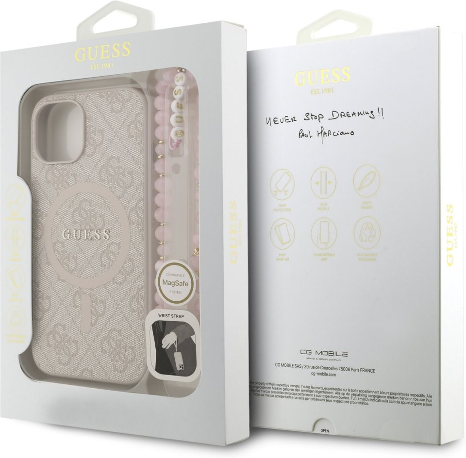 Guess PU Leather 4G Colored Ring Strap MagSafe zadný kryt je dokonalý doplnok pre váš telefón aj váš outfit, ktorý kombinuje funkčnosť a štýl v jednom. Je vyrobený z ľahkej a odolnej PU umelej kože a ponúka skvelú ochranu telefónu aj pohodlia pri používaní. Povrchová úprava krytu zaisťuje, že sa skvele drží v ruke a nešmýka sa, čo minimalizuje riziko vykĺznutia telefónu. Vďaka presnému tvaru perfektne sedí na telefóne a umožňuje ľahký prístup ku všetkým tlačidlám a konektorom. Tento kryt podporuje technológiu MagSafe, čo znamená, že je kompatibilný s bezdrôtovým nabíjaním a ďalšími MagSafe doplnkami. Guess "4G" elegantná potlač a kovové logo ponúka nielen decentný, ale aj luxusný vzhľad. Kryt je doplnený elegantným koralovým pútkom, ktorý môžete nasadiť na zápästie, aby vám telefón nevykĺzol z ruky. To vám zaručí bezpečné manipulovanie s vaším zariadením. Pokiaľ teda hľadáte kryt, ktorý kombinuje eleganciu a funkčnosť, je tento kúsok od Guess tou pravou voľbou pre vás.Kľúčové vlastnosti